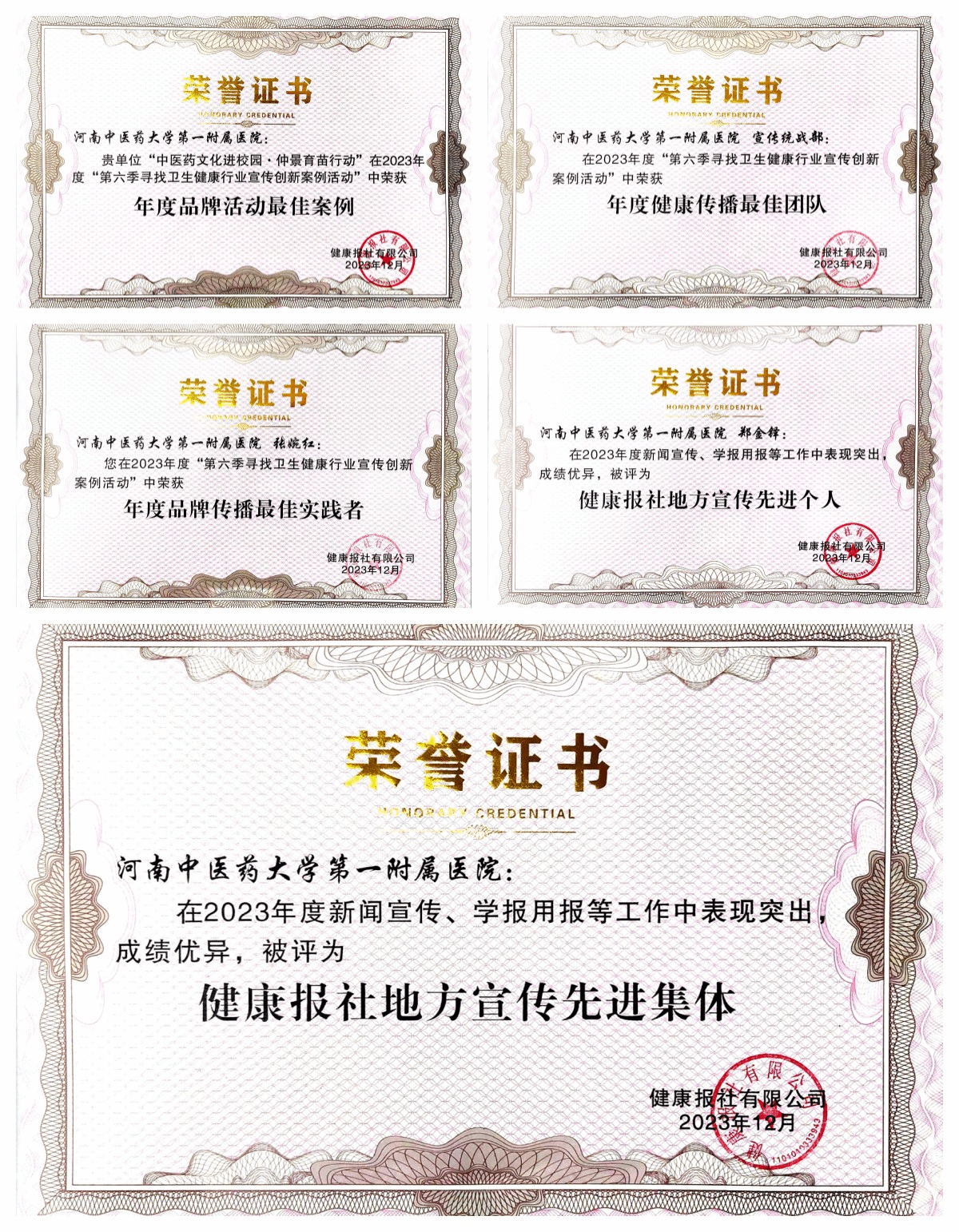 一附院荣获2023年度健康报社地方宣传先进集体,“中医药文化进校园·仲景育苗”荣获“卫生健康行业宣传创新案例活动”年度品牌活动最佳案例,宣传统战部荣获“卫生健康行业宣传创新案例活动”年度健康传播最佳团队,医院党委副书记张婉红荣获“卫生健康行业宣传创新案例活动”年度品牌传播最佳实践者,郑金铎荣获健康报社地方宣传先进个人等五项荣誉。医院成为2023年卫生健康综合宣传服务平台常务理事成员。