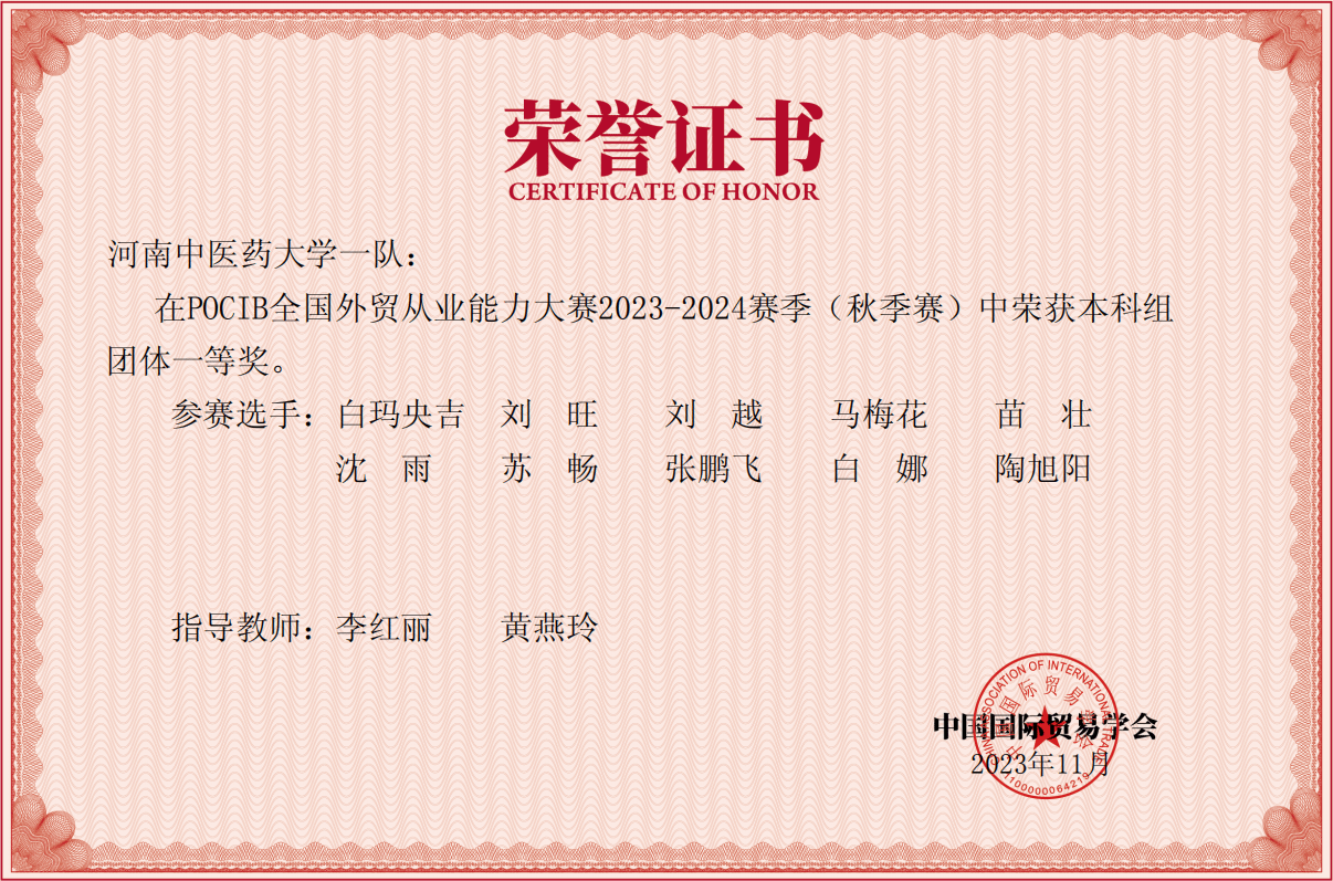 此外,在11月14日落下帷幕的由中国国际贸易学会主办的“第十三届POCIB全国外贸从业能力大赛2023-2024赛季(秋季赛)”中,管理学院教师李红丽、黄燕玲老师指导2021级市场营销专业30名同学组成三支队伍,在同199所本科院校、686支队伍、6860名选手的激烈竞争中,不畏强手,分别荣获本科组团体一等奖和二等奖。