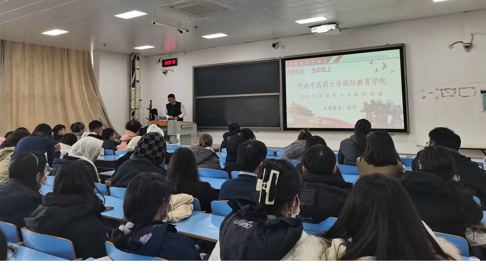 本网讯(文/李佳贞 图/何静雅)为了增强师生消防安全意识,2023年12月12日,国际教育学院邀请河南省消防协会彭冲教员于龙子湖校区综合楼A501教室开展消防安全知识讲座。国际教育学院教职工、海外办学项目学生及留学生共90余人一同参加此次讲座。