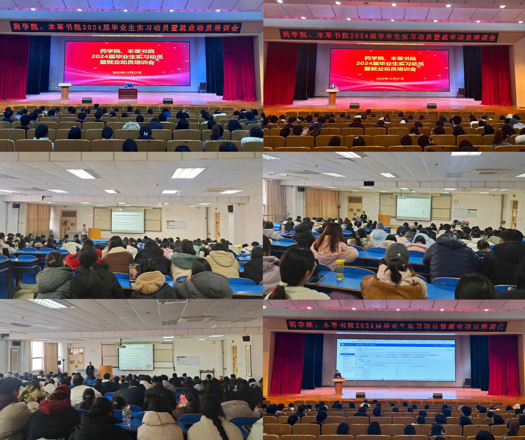 本网讯(文/高巍 图/姚湘)为帮助毕业生更好地适应实习生活,确保实习工作顺利开展,为就业做好充分准备,药学院、本草书院于2023年12月26日至27日按照各专业特点分别在俊学楼B101和二楼、三楼、四楼阶梯教室举行了2024届毕业生实习就业动员培训会。药学院副院长董诚明,本草书院副院长邢瑶,专业负责人、学院、书院相关负责老师、毕业班辅导员、全体毕业生参加了本次培训会。培训会由本草书院双创孵化中心主任高巍主持。
