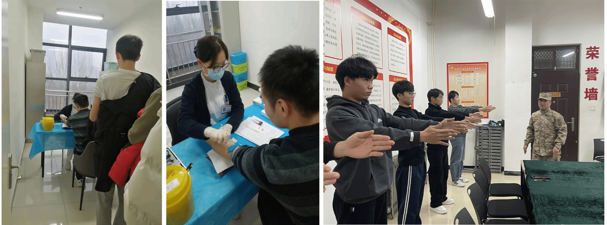 初检环节。校武装部联合第一附属医院龙子湖分院体检中心,对应征学生身高、体重、血压、视力、身体疤痕、血常规、尿常规、心电图、胸透等9项身体条件进行了初步筛查,严把兵员体格质量关。