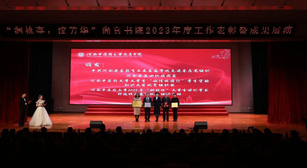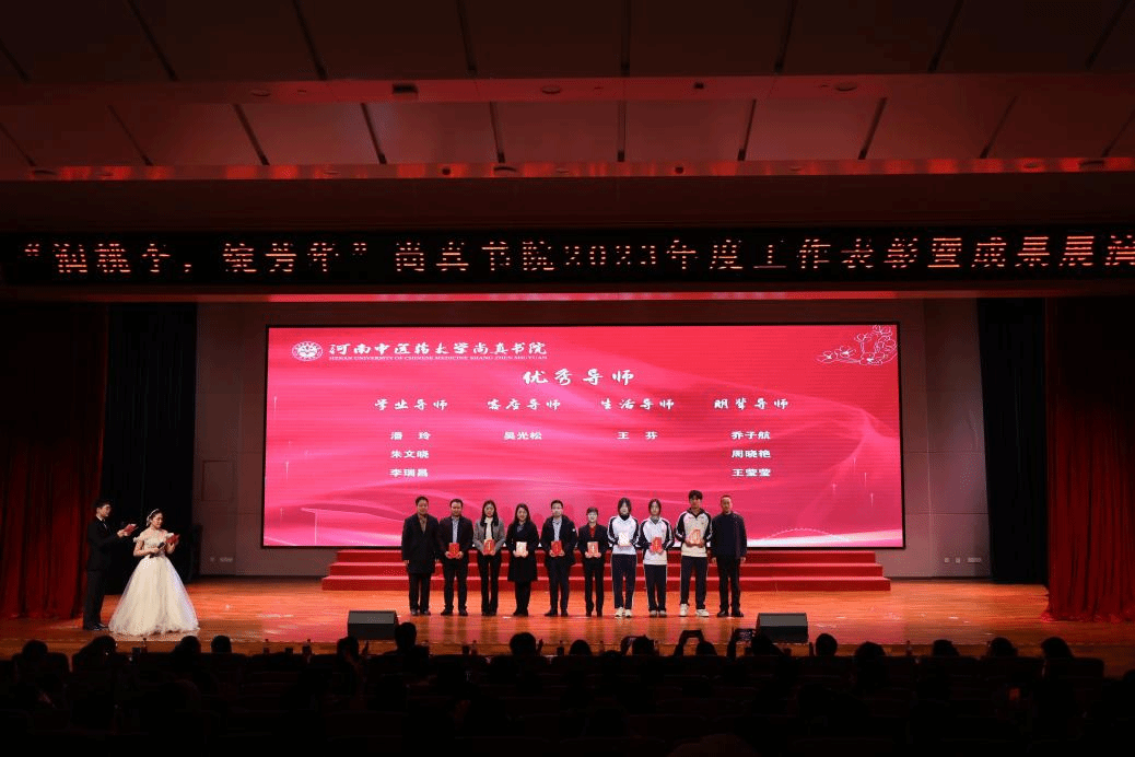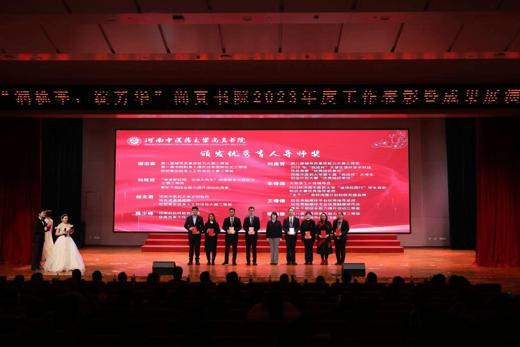 黄河浩浩,源远流长,医圣故里,桃李芬芳。在悠扬的校歌声中,尚真书院“润桃李 绽芳华”2023年度工作表彰暨成果展演活动正式拉开帷幕。在活动颁奖环节,田力为尚真书院颁发中共河南省委教育工委委属学校先进基层党组织、河南省五四红旗团委、校第十届“挑战杯”大学生创业计划大赛优秀组织单位、校大学生“诚信校园行”资助知识大赛优秀组织奖奖牌。李俊芝为荣获优秀育人导师奖的谢志豪、刘欣欣、杨文君、陈少峰、刘逸青、车奇涛、王倩倩、侯相俊等颁奖;禄保平、韩铁军为荣获优秀学业、客座、生活、朋辈导师奖的潘玲、朱文晓、李瑞昌、吴光松、王芬、乔子航、周晓艳、王莹莹等师生代表颁奖;体育学院、尚真书院、管理学院、外语学院、信息技术学院领导分别为荣获“品德之星”“智慧之星”“运动之星”“文艺之星”“奉献之星”的100位优秀学生颁奖。