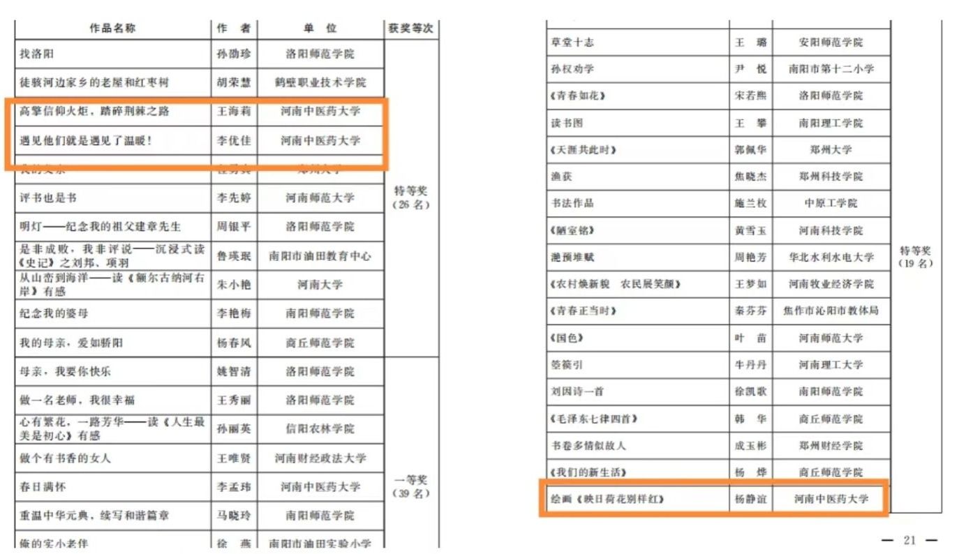 该活动旨在深入学习贯彻习近平新时代中国特色社会主义思想和党的二十大精神,推动全民阅读扩大覆盖、提升品质、增强实效,以书香中国建设促进文化强国建设,推进文化自信自强,铸就社会主义文化新辉煌。活动开展以来,校工会女职工委员会高度重视、精心组织、广泛宣传,女职工们踊跃参与、潜心创作。31个基层工会积极投稿征文、家书、书画三大类原创作品46件。校女职工委员会组织专家对参评作品进行了严格把关和认真筛选,最终推荐了15件优秀作品参加省教科文卫体工会系统评选。这些作品分别获得了特等奖3个、一等奖2个、二等奖3个和优秀奖3个。其中信息化办公室工会王海莉老师的《高擎信仰火炬,踏碎荆棘之路》、二附院工会李优佳老师的《遇见他们就是遇见了温暖!》、二附院工会杨静谊老师的《映日荷花别样红》获特等奖,三附院工会李孟玮老师的《春日满怀》、中医药科学院工会王培智老师的《期待未来遇见更好的你———献给我们“龙抬头”的孩子》2件作品荣获一等奖,万琼、李晓岚、张慧娟等3位老师获二等奖,钱如月、倪婷婷、胡京京等3位老师获优秀奖。