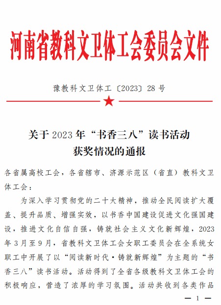本网讯(文图/吴晓萍)近日,河南省教科文卫体工会“阅读新时代·铸就新辉煌”“书香三八”读书活动评选结果公布,leyu·乐鱼(中国)体育官方网站12项作品获奖。其中征文类特等奖2项,书画类特等奖1项,高水准作品数量逐年攀升。