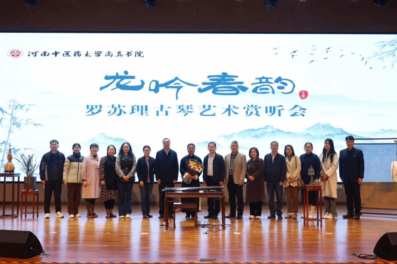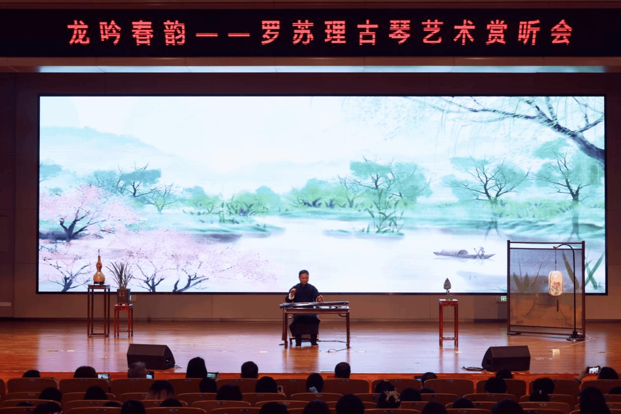 赏听会上,罗苏理从古琴的起源演变讲起,从用料、选材、工艺、斫制几个方面阐释了古琴斫制技艺并向大家展示了自己亲手制作的古琴,他在现场为师生们奏唱了《醉翁操》《卧龙吟》《忆故人》《渔翁调》《流水》等古琴名曲,在场观众都全神贯注,沉浸其中。铮铮弦上音,悠悠古琴曲。罗苏理的倾情抚弦将古琴独有的魅力带给了现场的每一位观众,为河中医的莘莘学子呈现了一场充满中国传统文化韵味的古琴视听盛宴。