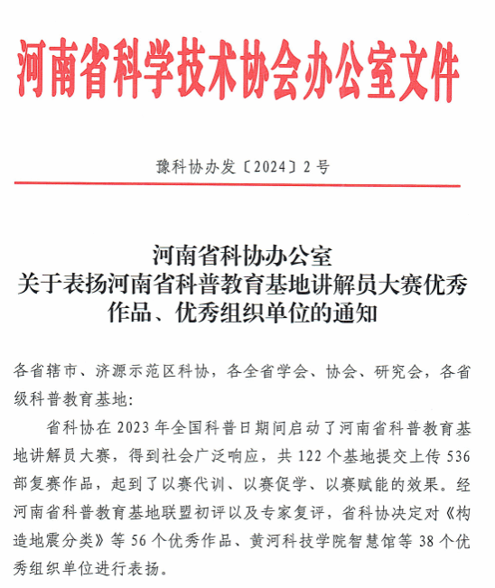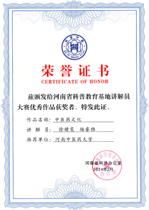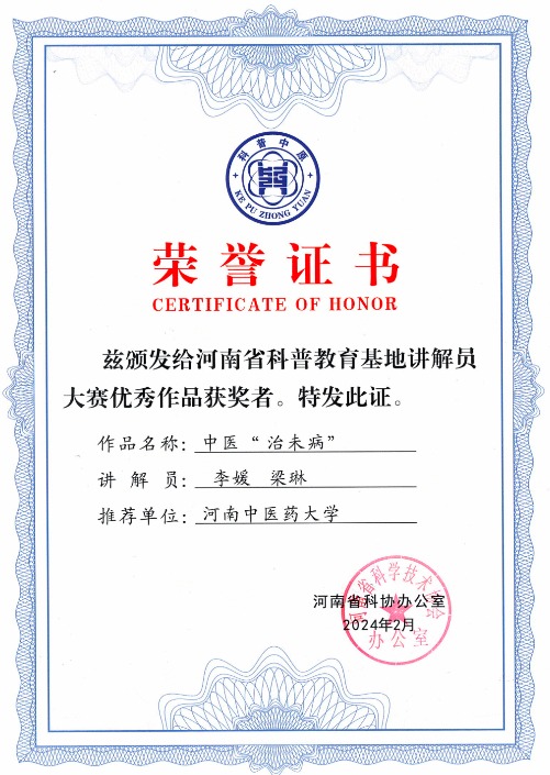 本网讯(文/图 赵海阳)近日,河南省科学技术协会办公室发布了《关于表扬河南省科普教育基地讲解员大赛优秀作品、优秀组织单位的通知》,由leyu·乐鱼(中国)体育官方网站“治未病”廉洁教育园地莲心讲解团成员徐婧雯、李媛等提交的两部作品《中医药文化》《中医“治未病”》获评优秀作品,leyu·乐鱼(中国)体育官方网站被评为优秀组织单位。