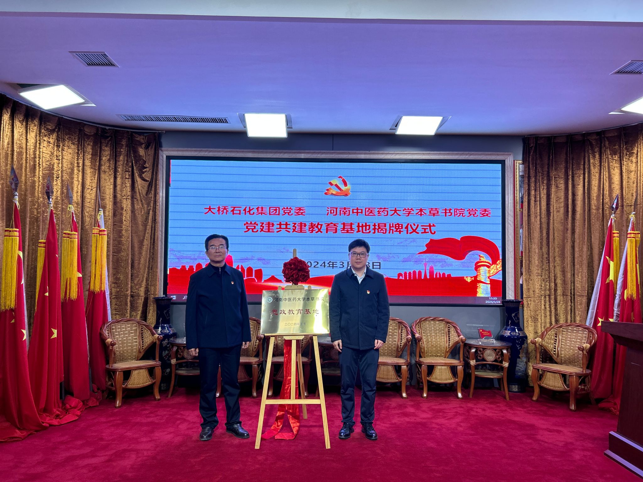 大桥石化集团党委副书记、副总裁冯江新对本草书院一行的到来表示欢迎,并通过微党课的形式与大家分享大桥党建“三力经验”,讲述大桥企业文化,勉励同学们要知党恩、跟党走,坚定理想信念、涵养爱国情怀。随后,本草书院党委与大桥石化党委签订党建共建协议,并举行书院思政教育基地的授牌仪式。