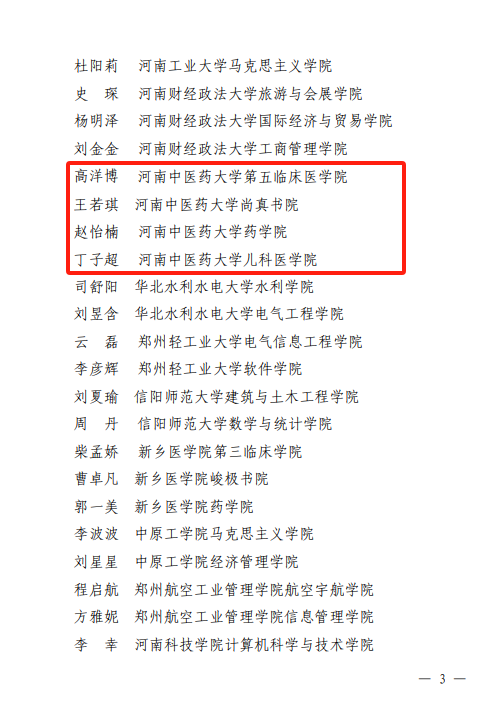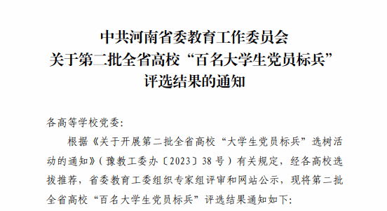 本网讯(文/翟羽佳 图/文件部分截图)近日,河南省教育厅办公室发布《关于第二批全省高校百名大学生党员标兵评选结果》的通知,leyu·乐鱼(中国)体育官方网站第五临床医学院高洋博、尚真书院王若琪、药学院赵怡楠、儿科医学院丁子超4名同学获评河南省“大学生党员标兵”荣誉称号。