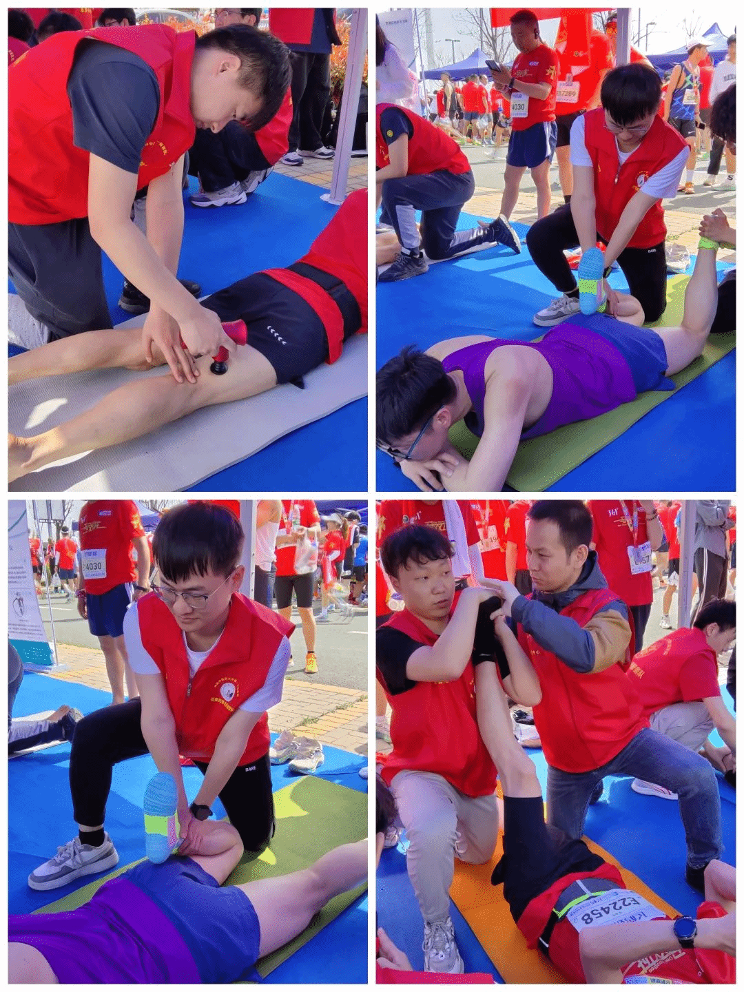 第一附属医院康复诊疗中心在半程马拉松终点站,为运动员进行运动康复及运动损伤急救等相关工作,凭借专业的康复器械与过硬的诊疗技术,为运动员们的健康保驾护航。