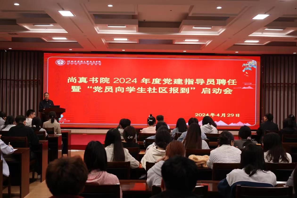 本网讯(文/谢志豪 图/王庆凡)为深入推进尚真书院“党旗引领工程”实施,进一步探索“党建+”社区建设,提升党建引领社区治理效能,强化学生党员作用发挥,实现纵合横通强党建的书院建设新格局,2024年4月29日,尚真书院在图书馆第二报告厅举行2024年度党建指导员聘任暨“党员向学生社区报到”启动会,书院领导班子、各党支部书记、中心主任、育人导师、2021级、2022级全体学生党员、学生会和学生社区主要负责人参加此次会议。会议由尚真书院党委副书记苏峰主持。