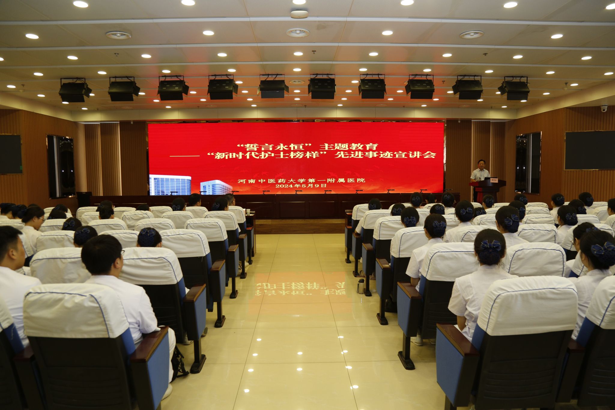 本网讯(文/郑金铎 图/赵庆庆)学习身边榜样,凝聚奋进力量,2024年5月9日上午,在第113届“5·12”国际护士节来临之际,一附院举办“誓言永恒”主题教育——“新时代护士榜样”先进事迹宣讲会。一附院党委书记翟剑波,党委副书记张婉红,党委办公室主任许武军,团委书记、学工办主任陈占科等出席会议。医院新入职护士100余人等参加会议。会议由张婉红主持。