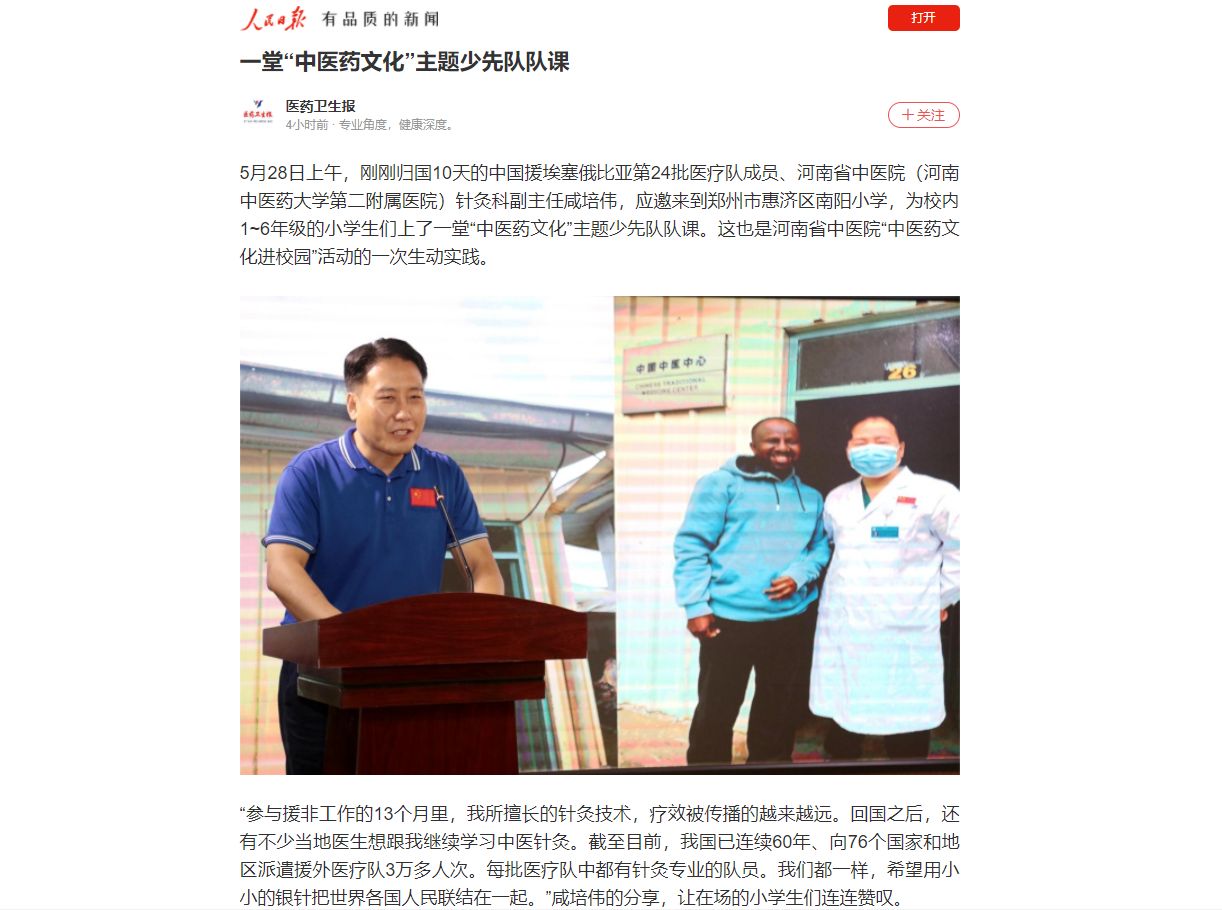 5月28日上午,刚刚归国10天的中国援埃塞俄比亚第24批医疗队成员、河南省中医院(leyu·乐鱼(中国)体育官方网站第二附属医院)针灸科副主任咸培伟,应邀来到郑州市惠济区南阳小学,为校内1~6年级的小学生们上了一堂“中医药文化”主题少先队队课。这也是河南省中医院“中医药文化进校园”活动的一次生动实践。
