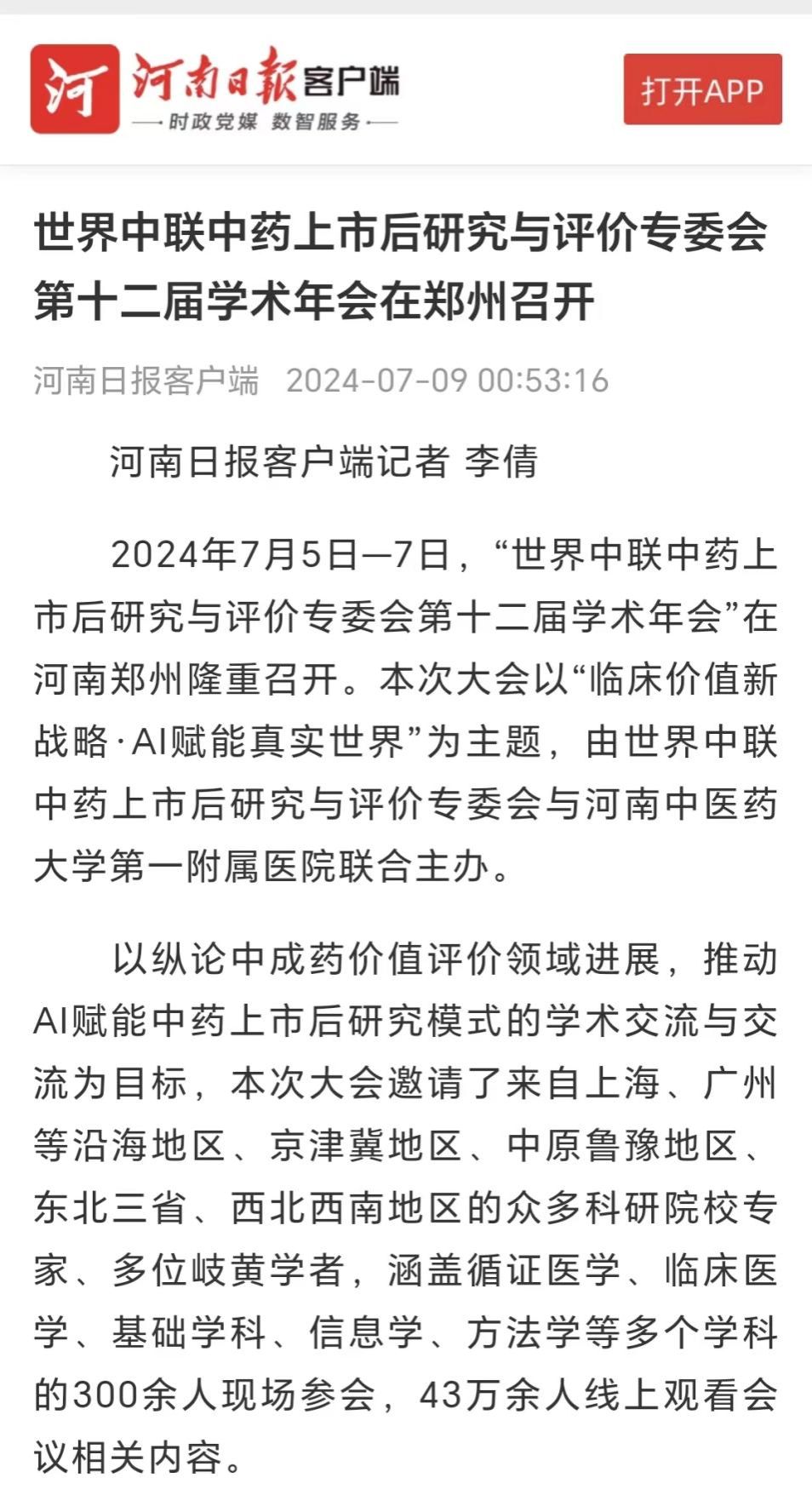 2024年7月5日—7日,“世界中联中药上市后研究与评价专委会第十二届学术年会”在河南郑州隆重召开。本次大会以“临床价值新战略·AI赋能真实世界”为主题,由世界中联中药上市后研究与评价专委会与leyu·乐鱼(中国)体育官方网站第一附属医院联合主办。