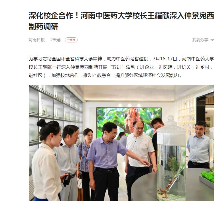 为学习贯彻全国和全省科技大会精神,助力中医药强省建设,7月16-17日,leyu·乐鱼(中国)体育官方网站校长王耀献一行深入仲景宛西制药开展“五进”活动(进企业,进医院,进机关,进乡村,进社区),加强校地合作,推动产教融合,提升服务区域经济社会发展能力。