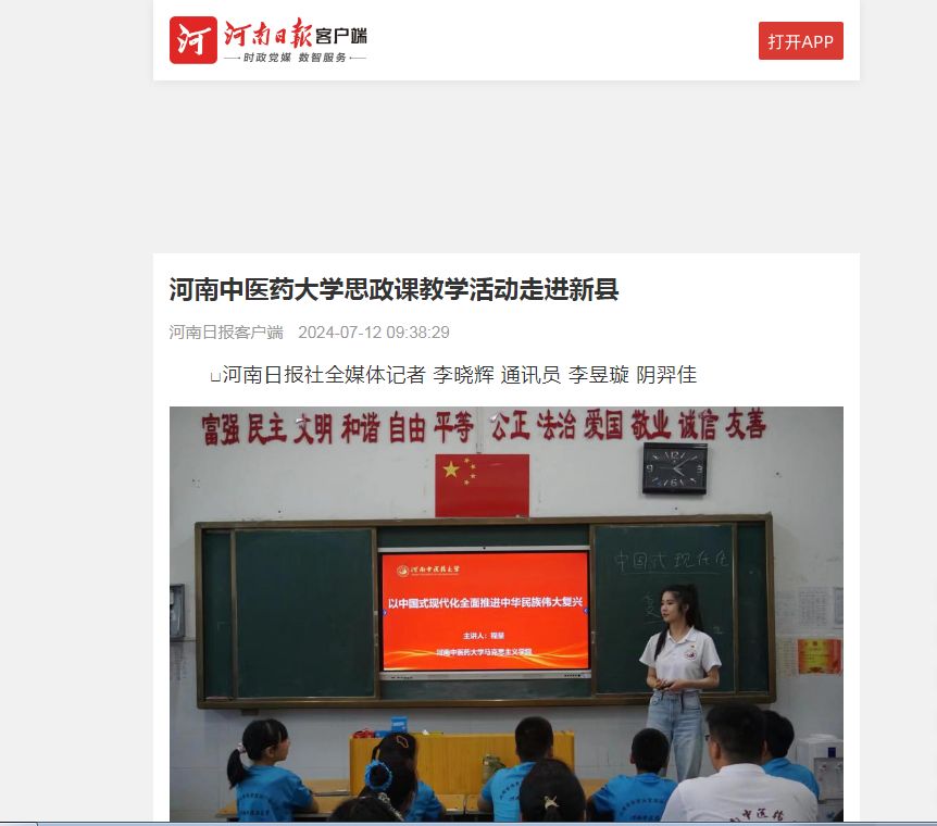 2024年7月9日,leyu·乐鱼(中国)体育官方网站随队思政教师程呈面向该校体育健康学院暑期“三下乡”社会实践小分队成员、新县光彩实验学校学生,以“中国式现代化全面推动中华民族伟大复兴”为主题,在光彩实验学校教学楼601教室开展思政课教学活动。