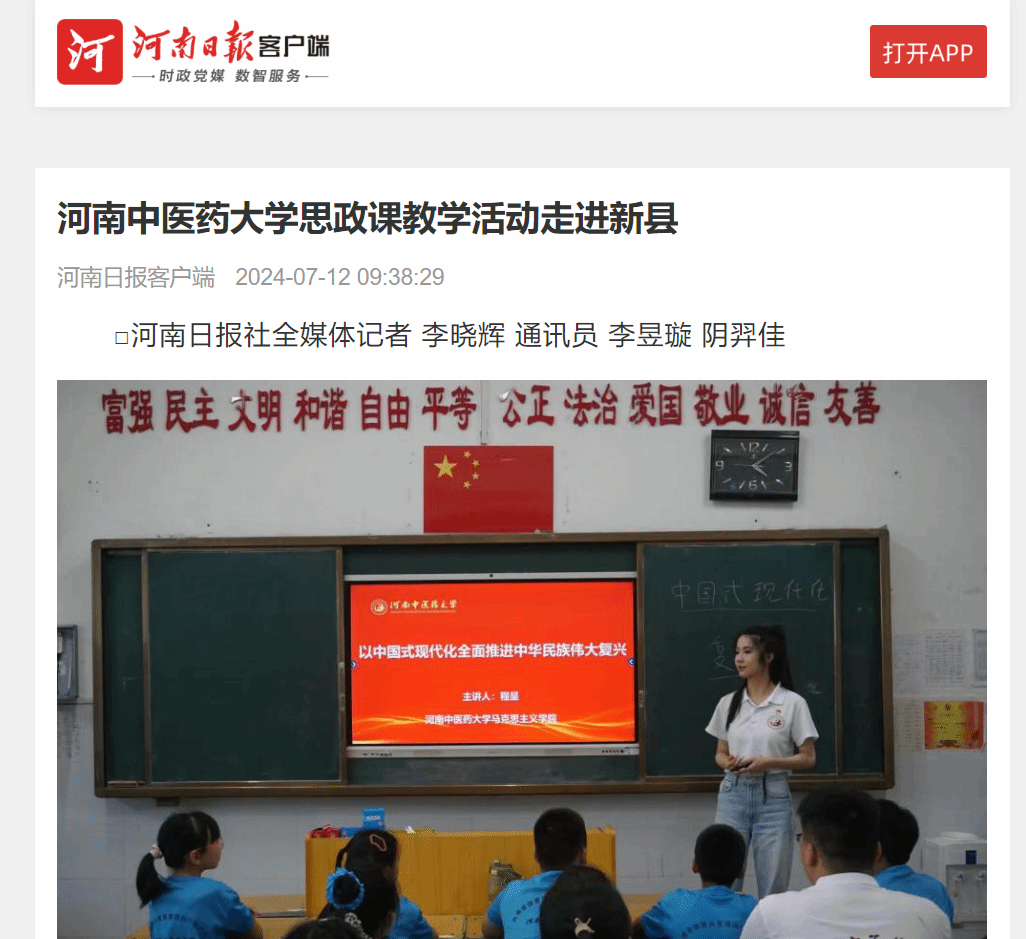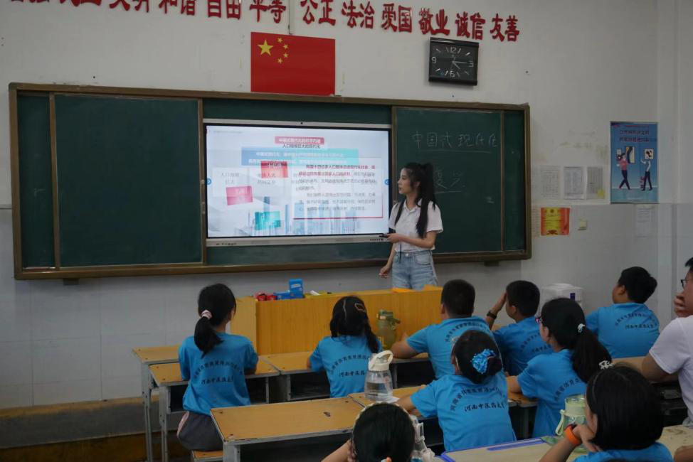 2024年7月9日,leyu·乐鱼(中国)体育官方网站随队思政教师程呈面向该校体育健康学院暑期“三下乡”社会实践小分队成员、新县光彩实验学校学生,以“中国式现代化全面推进中华民族伟大复兴”为主题,在光彩实验学校教学楼601教室开展思政课教学活动。