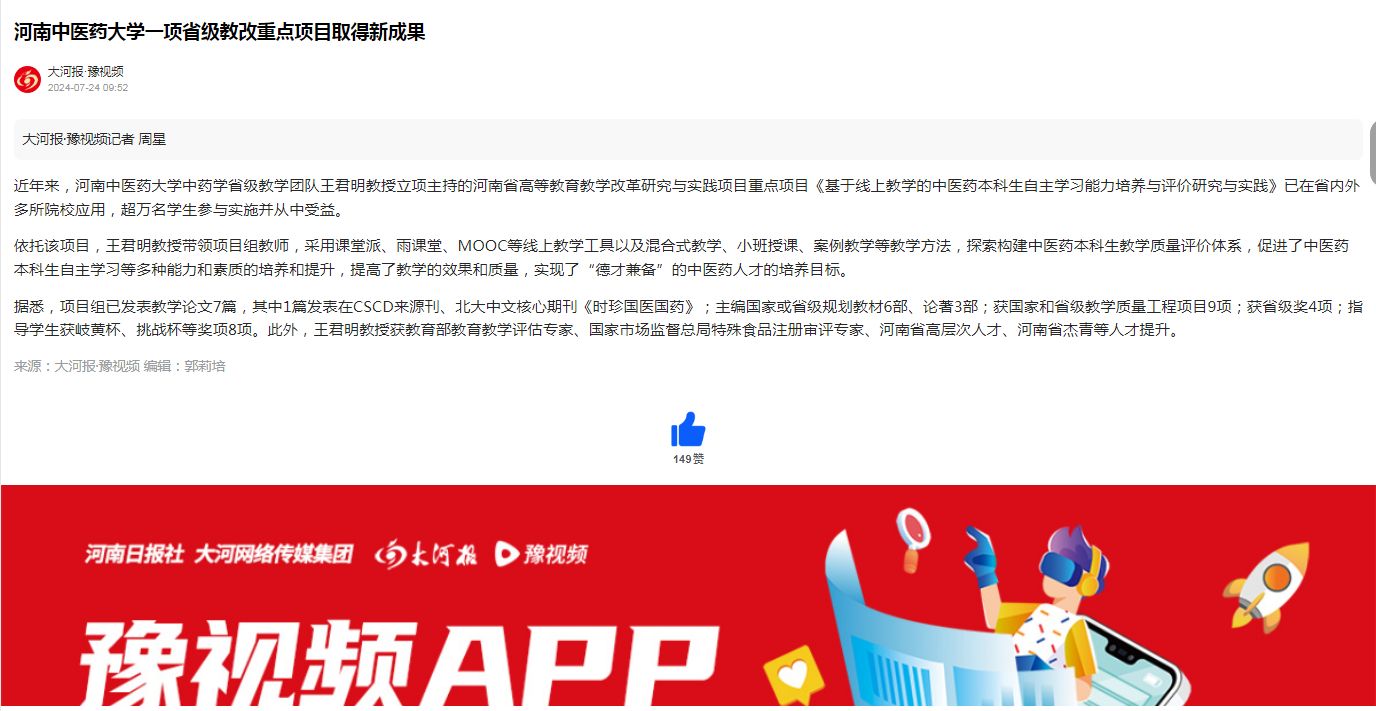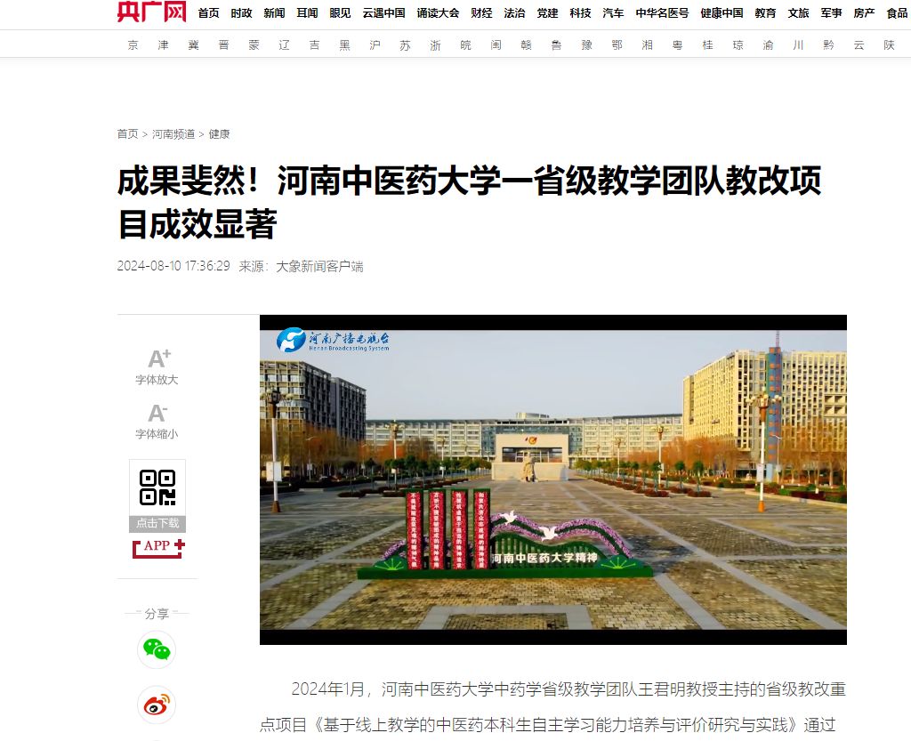 近年来,leyu·乐鱼(中国)体育官方网站中药学省级教学团队王君明教授立项主持的河南省高等教育教学改革研究与实践项目重点项目《基于线上教学的中医药本科生自主学习能力培养与评价研究与实践》已在省内外多所院校应用,超万名学生参与实施并从中受益。