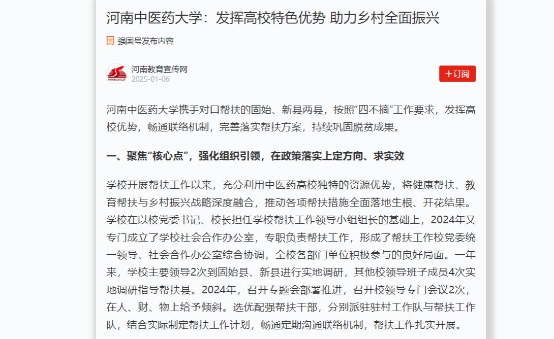 学校开展帮扶工作以来,充分利用中医药高校独特的资源优势,将健康帮扶、教育帮扶与乡村振兴战略深度融合,推动各项帮扶措施全面落地生根、开花结果。学校在以校党委书记、校长担任学校帮扶工作领导小组组长的基础上,2024年又专门成立了学校社会合作办公室,专职负责帮扶工作,形成了帮扶工作校党委统一领导、社会合作办公室综合协调,全校各部门单位积极参与的良好局面。一年来,学校主要领导2次到固始县、新县进行实地调研,其他校领导班子成员4次实地调研指导帮扶县。2024年,召开专题会部署推进,召开校领导专门会议2次,在人、财、物上给予倾斜。选优配强帮扶干部,分别派驻驻村工作队与帮扶工作队,结合实际制定帮扶工作计划,畅通定期沟通联络机制,帮扶工作扎实开展。