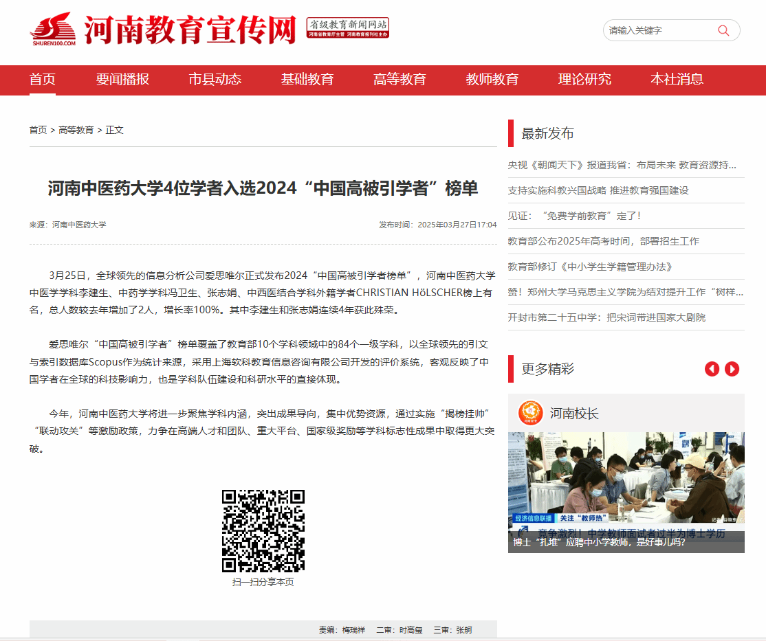 河南教育宣传网丨leyu·乐鱼(中国)体育官方网站4位学者入选2024“中国高被引学者”榜单