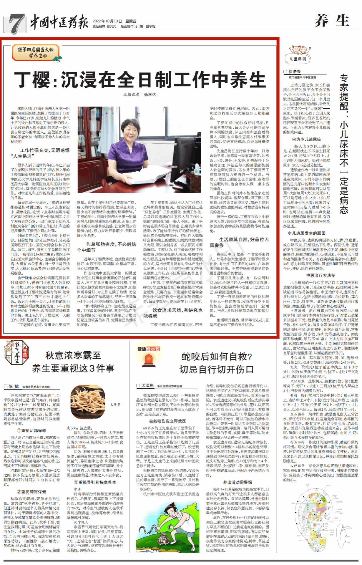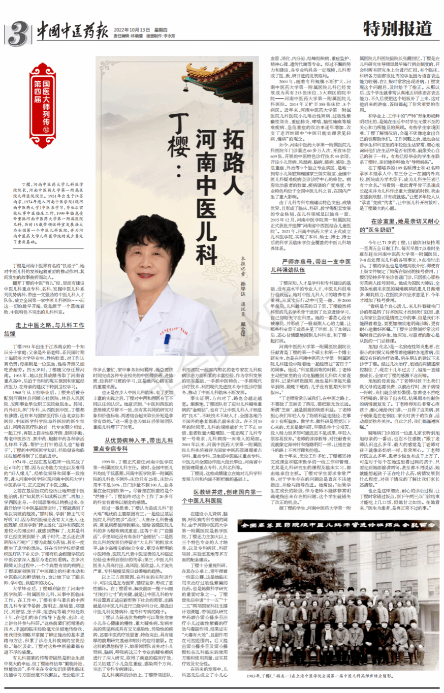 编者按:2022年10月13日,《中国中医药报》三个版面全面报道了一附院丁樱教授的个人事迹和学术思想等内容。现全文刊发如下: