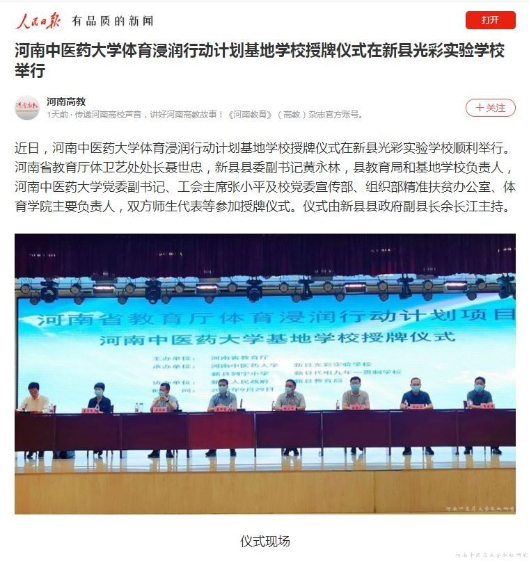 人民日报 河南高教等丨leyu·乐鱼(中国)体育官方网站体育浸润行动计划基地学校授牌仪式在新县光彩实验学校举行