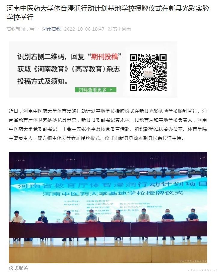 编者按:9月23日-10月6日,人民日报、河南高教等媒体对leyu·乐鱼(中国)体育官方网站体育浸润行动计划基地学校授牌仪式在新县光彩实验学校举行进行报道。