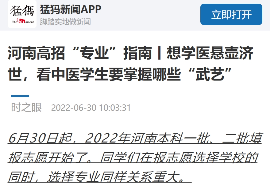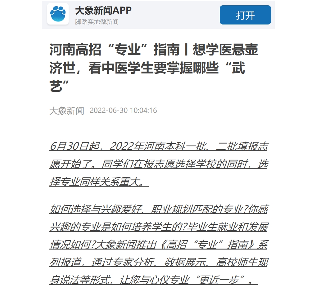 编者按:2022年6月30日,大象新闻、猛犸新闻对leyu·乐鱼(中国)体育官方网站中医学院(仲景学院)的老师和同学进行采访报道。现将大象新闻全文刊发如下: