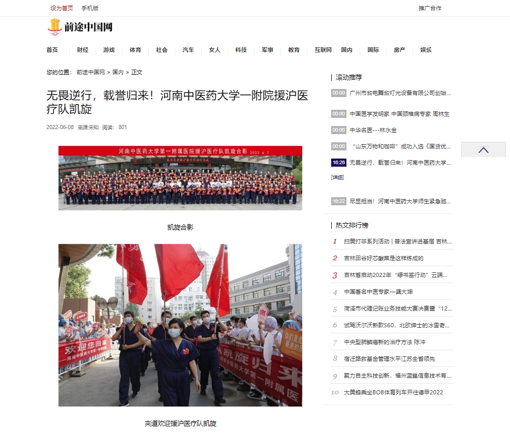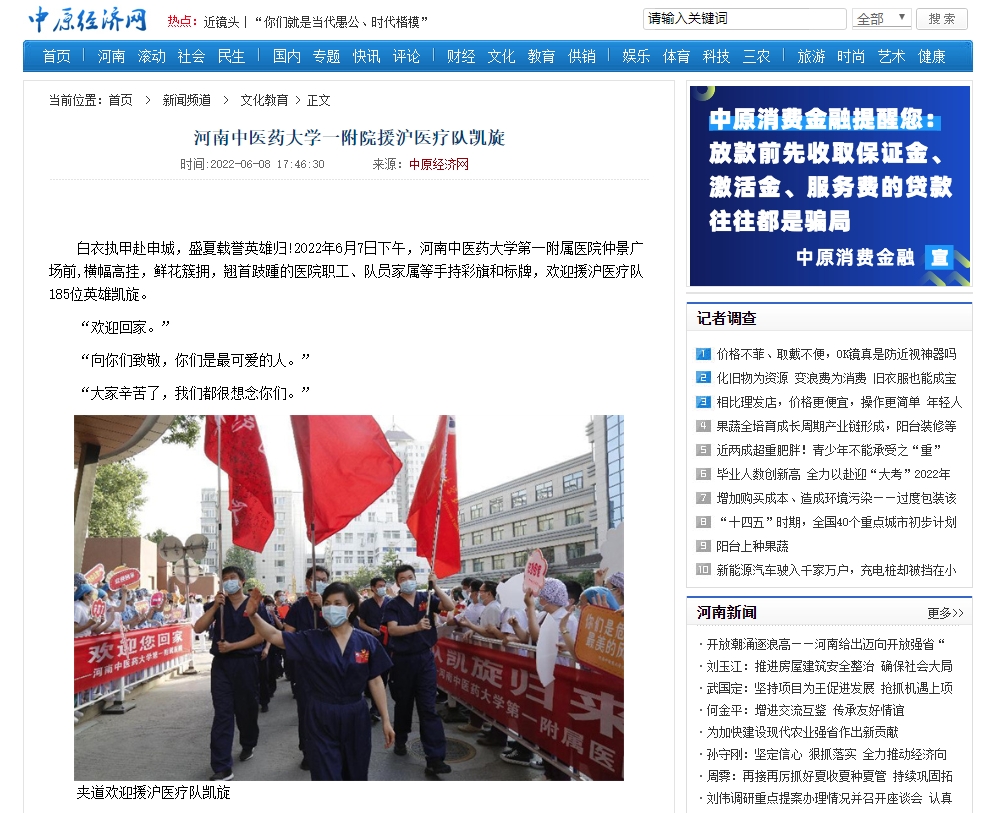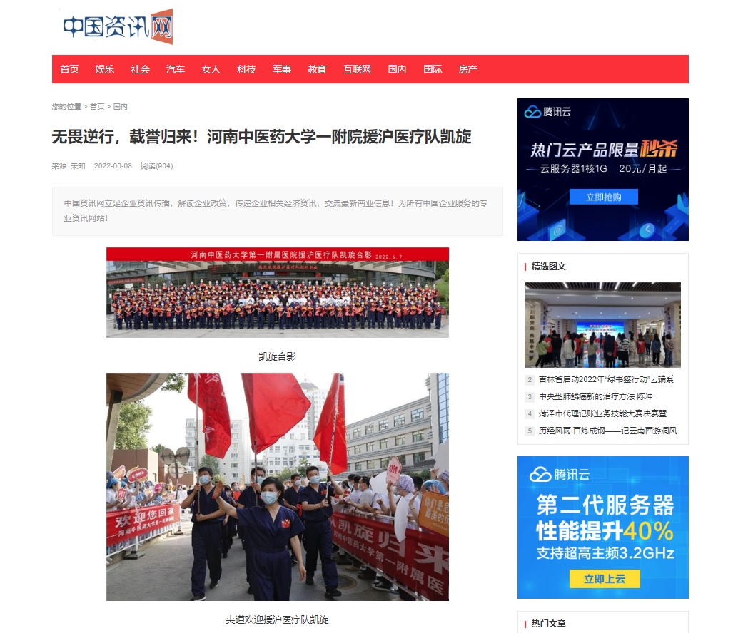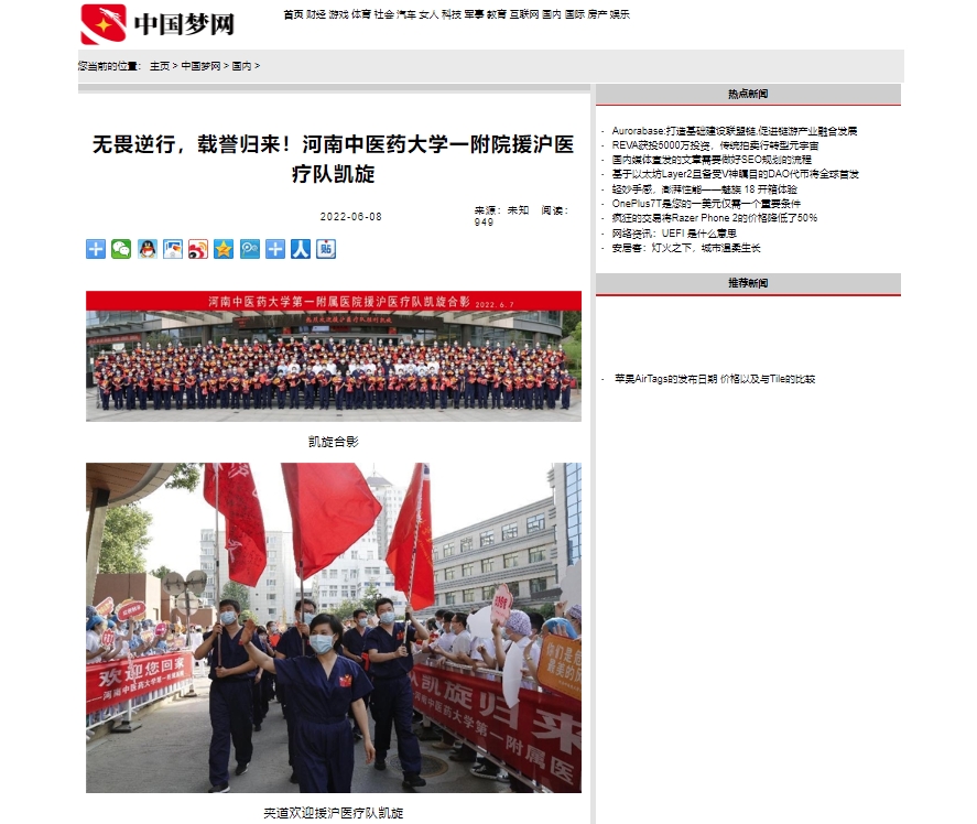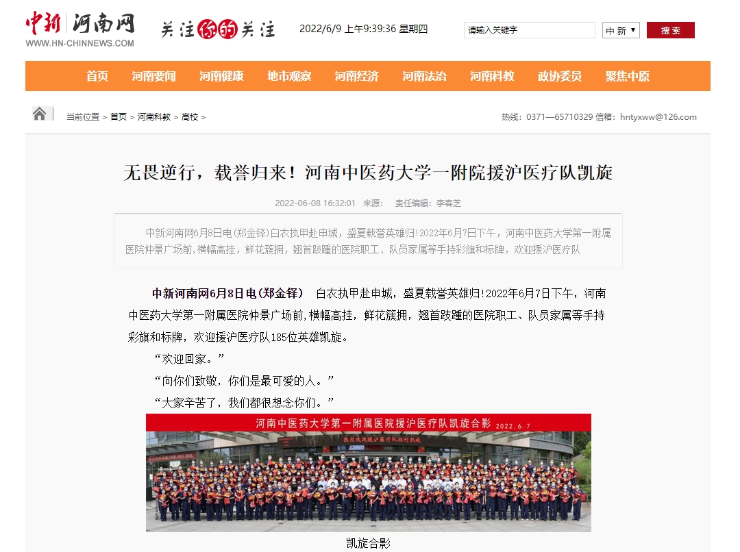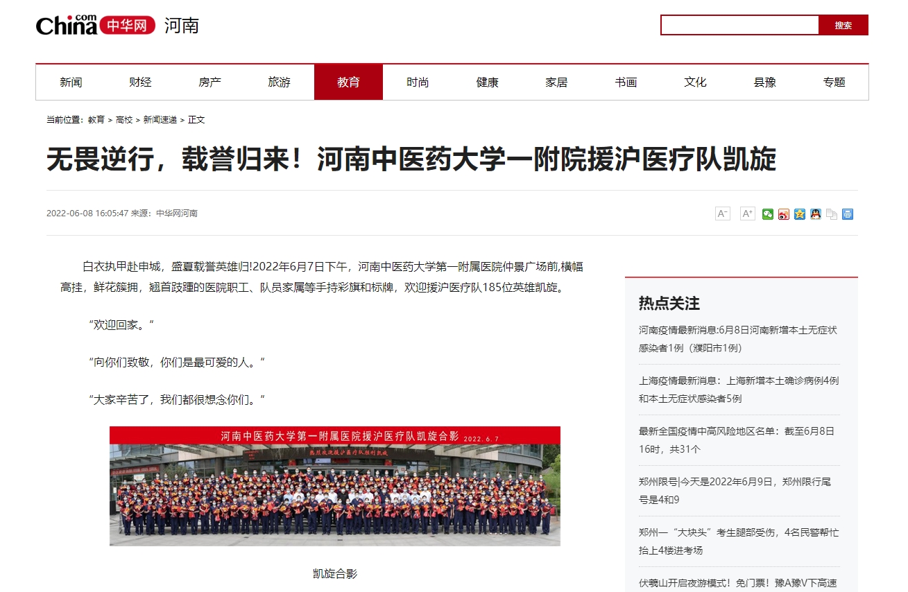 编者按:2022年6月8日,中华网、中华高校网、财经中国、缤纷中国、科技中国、美丽中国报、前途中国网、中国梦网、中国报讯网、中国信息网、中国科技网、中国资讯网、河南高校资讯网、中原经济网、中新网、新豫网、河南经济论坛、河南高校行等多家媒体对leyu·乐鱼(中国)体育官方网站一附院援沪医疗队凯旋进行报道。