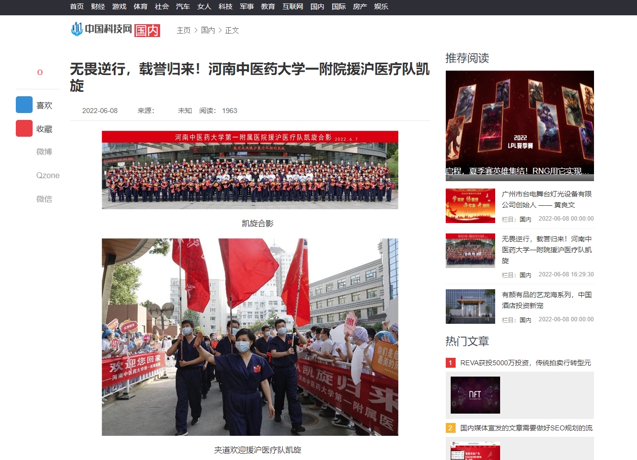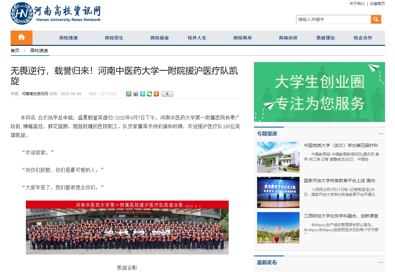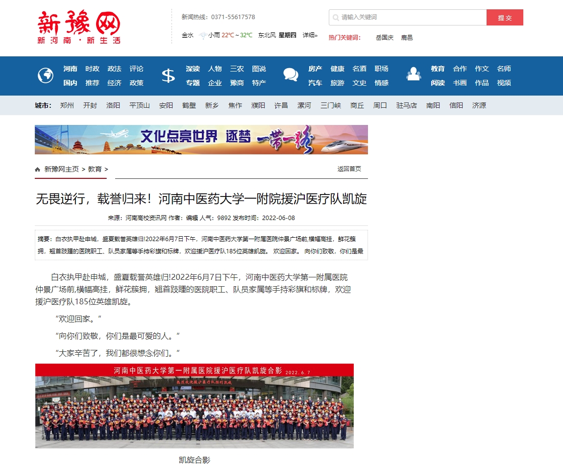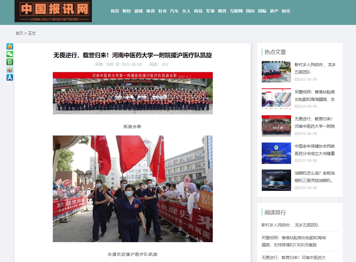 编者按:2022年6月8日,中华网、中华高校网、财经中国、缤纷中国、科技中国、美丽中国报、前途中国网、中国梦网、中国报讯网、中国信息网、中国科技网、中国资讯网、河南高校资讯网、中原经济网、中新网、新豫网、河南经济论坛、河南高校行等多家媒体对leyu·乐鱼(中国)体育官方网站一附院援沪医疗队凯旋进行报道。