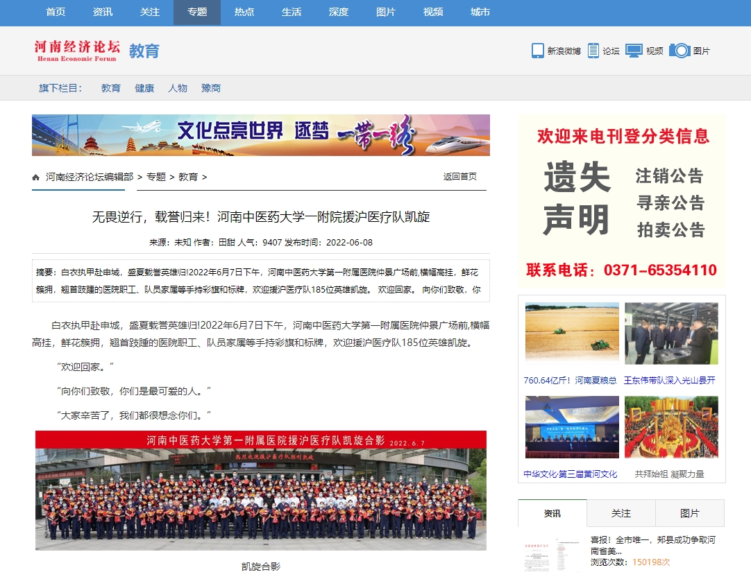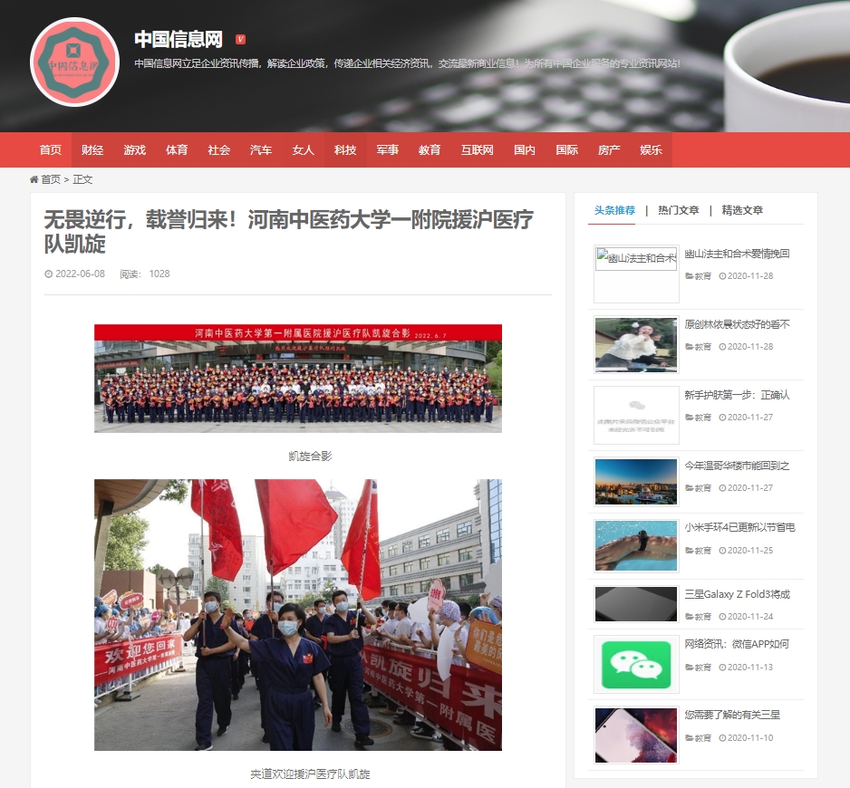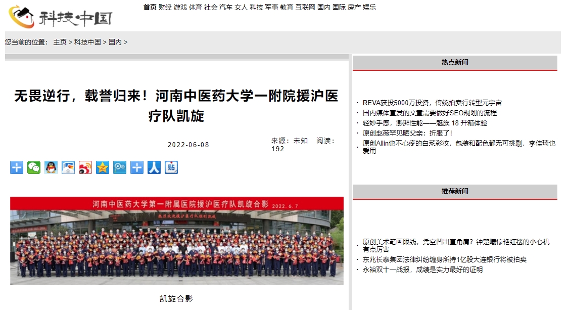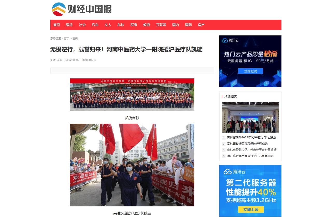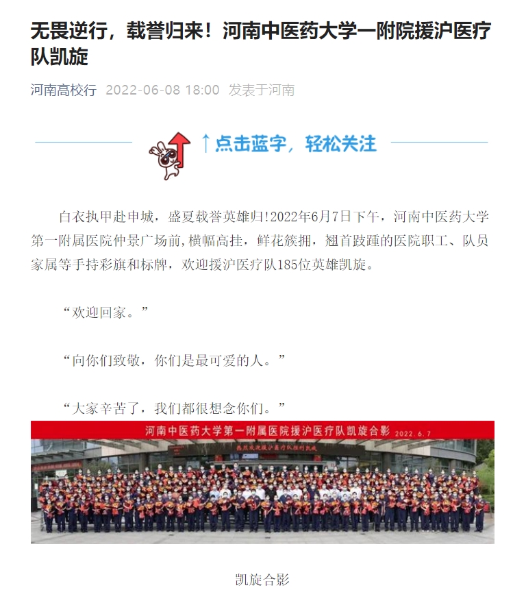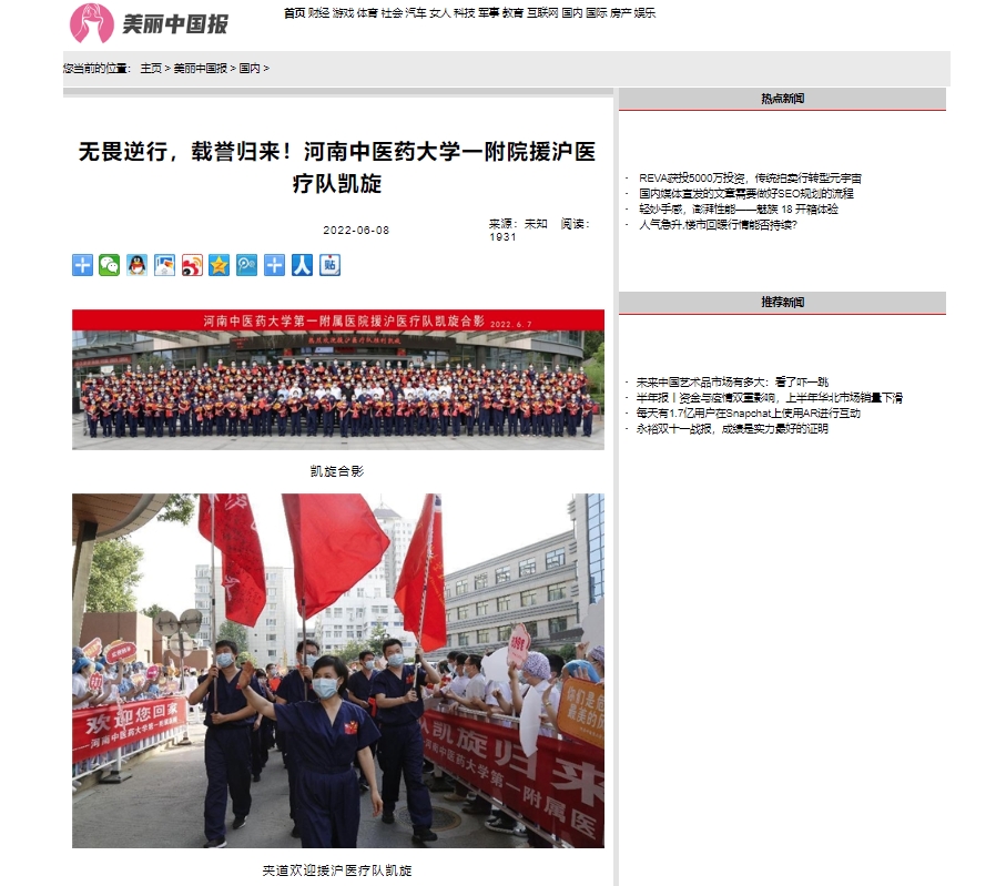 编者按:2022年6月8日,中华网、中华高校网、财经中国、缤纷中国、科技中国、美丽中国报、前途中国网、中国梦网、中国报讯网、中国信息网、中国科技网、中国资讯网、河南高校资讯网、中原经济网、中新网、新豫网、河南经济论坛、河南高校行等多家媒体对leyu·乐鱼(中国)体育官方网站一附院援沪医疗队凯旋进行报道。