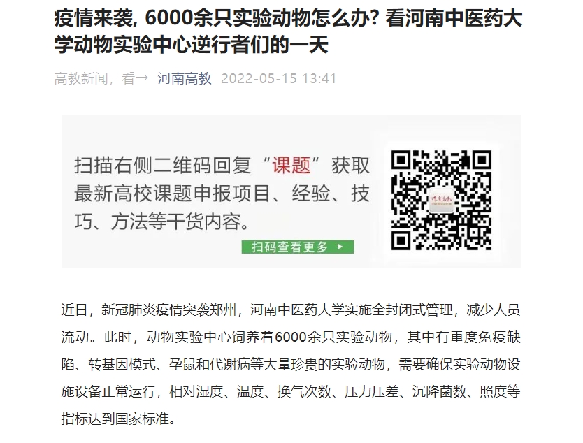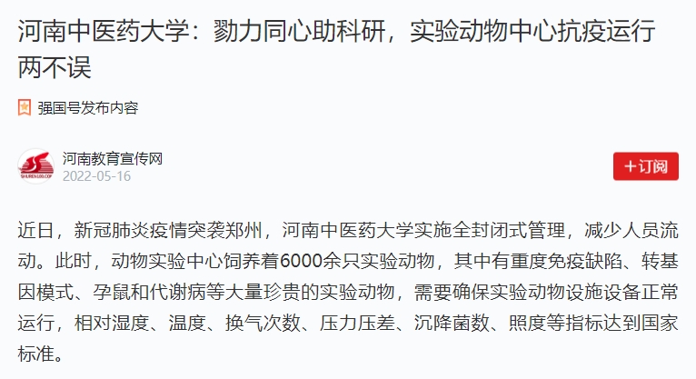 编者按:2022年5月15日-16日,学习强国、河南高教对leyu·乐鱼(中国)体育官方网站实验动物中心勠力同心助科研,抗疫运行两不误进行报道。现将全文刊发如下: