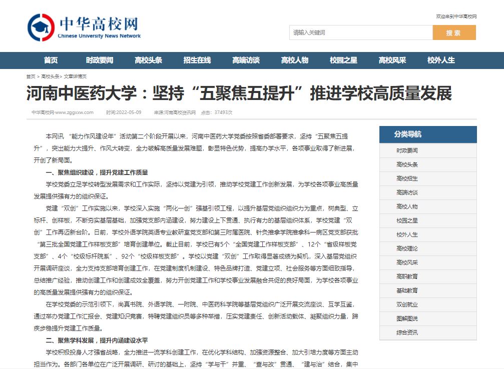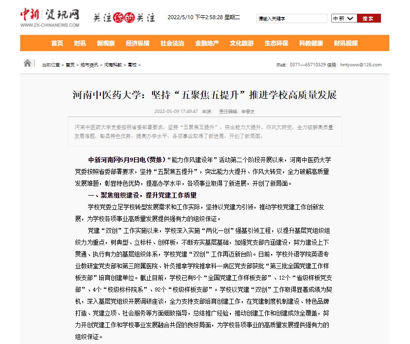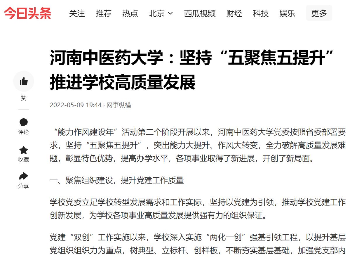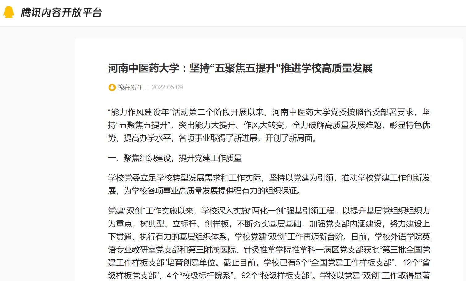 编者按:2022年5月9日,中华高校网、中华网、中新网、河南高校资讯网、新豫网、中原经济网、河南经济论坛、河南高校行、腾讯内容开放平台、百家号、一点资讯、今日头条等多家媒体对leyu·乐鱼(中国)体育官方网站坚持“五聚焦五提升”推进学校高质量发展进行报道。