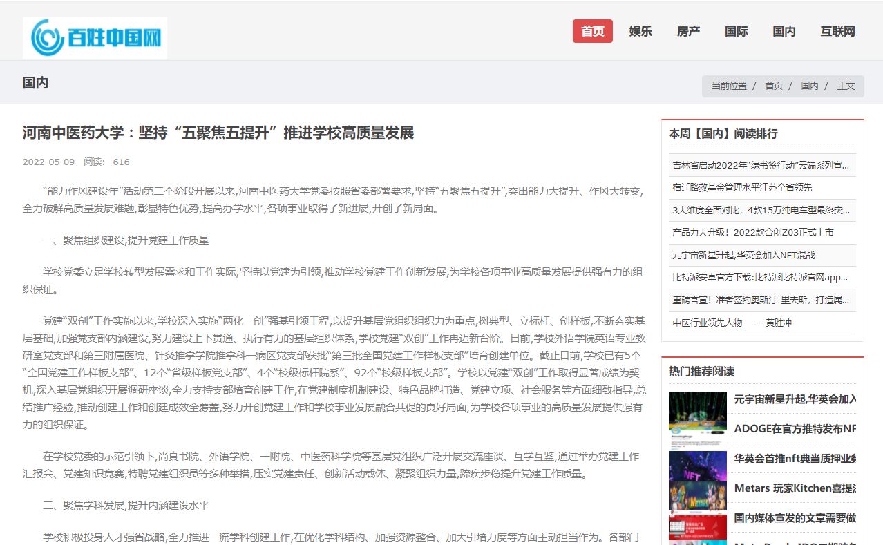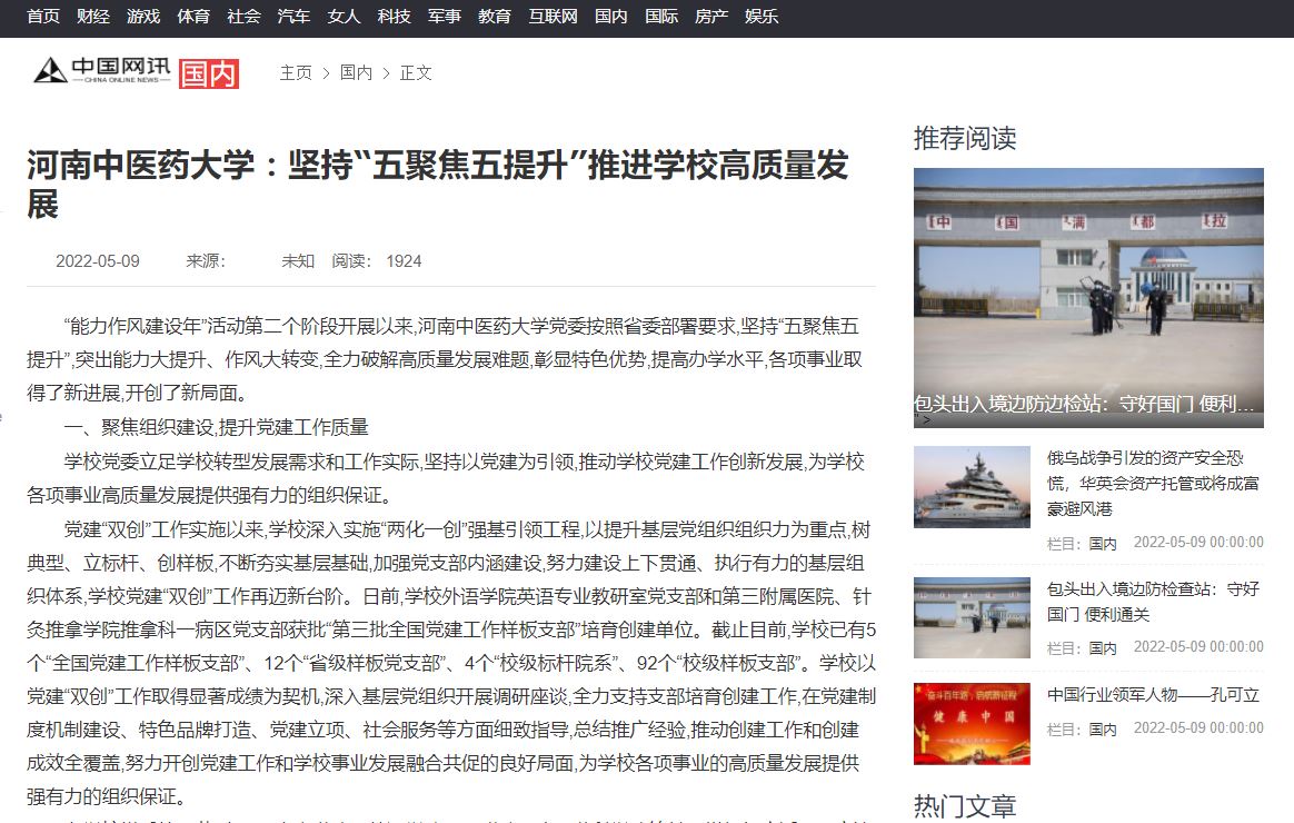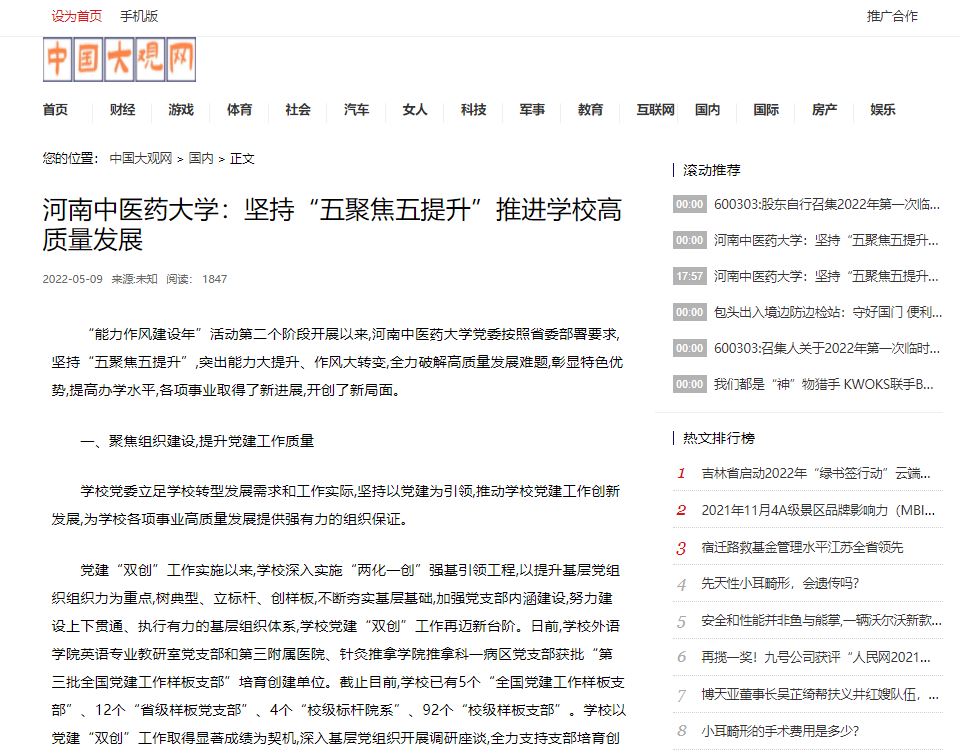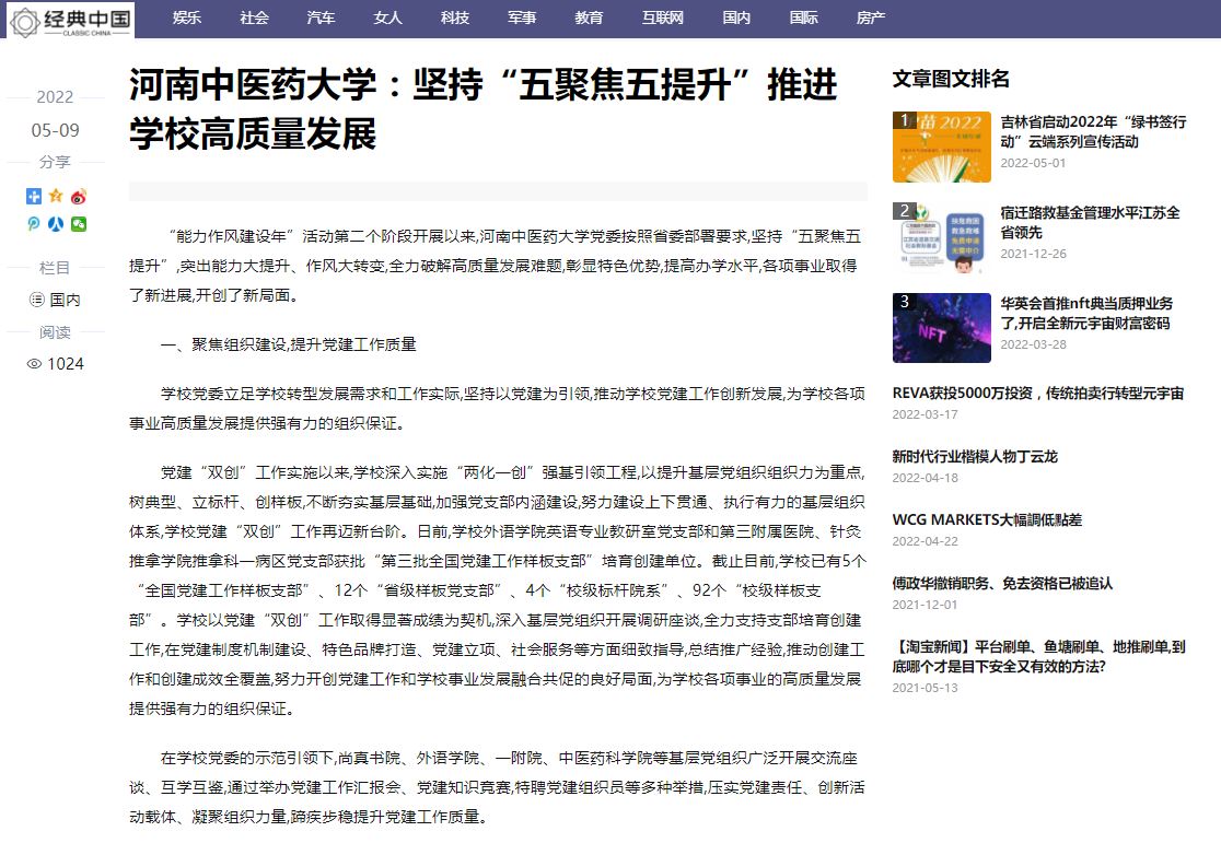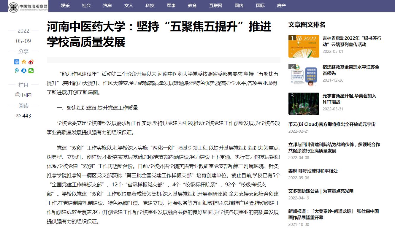 编者按:2022年5月9日,中国前沿观察网、中国网讯、中国侨报网、经典中国、中国大观网、百姓中国网、缤纷中国、科技中国、美丽中国报、创业中国、网易新闻等多家媒体对leyu·乐鱼(中国)体育官方网站坚持“五聚焦五提升”推进学校高质量发展进行报道。