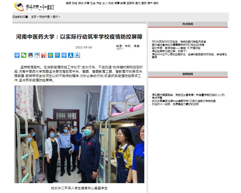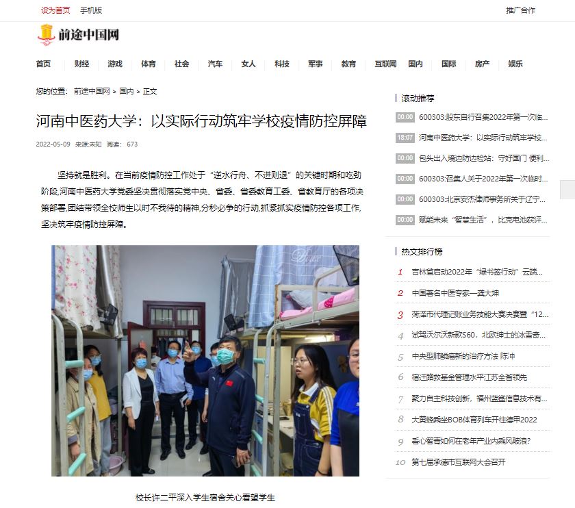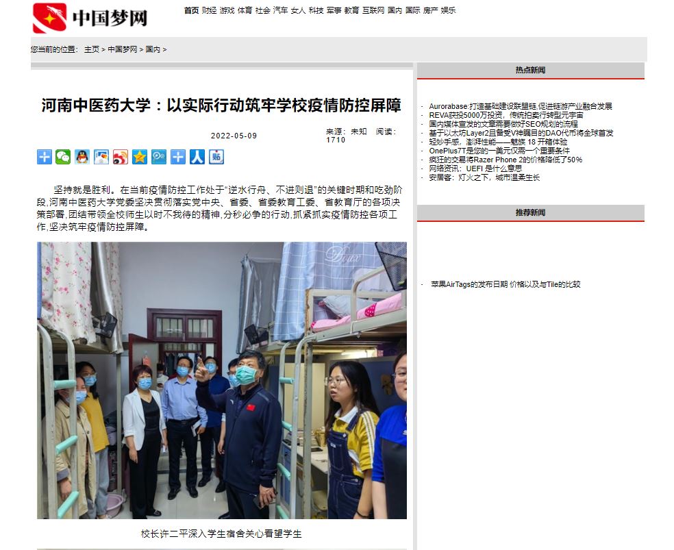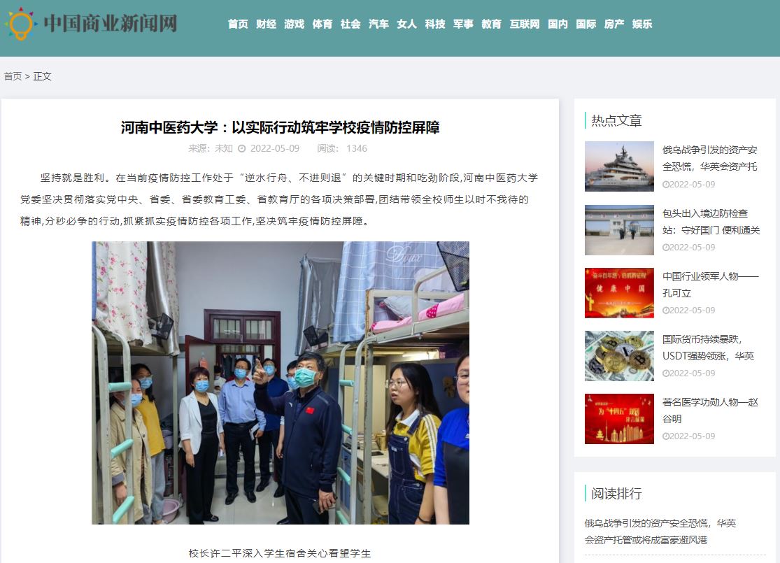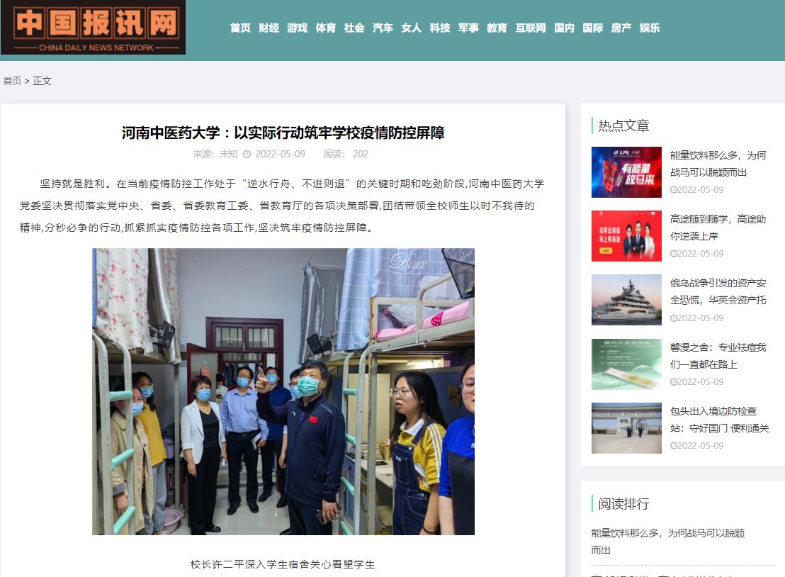 编者按:2022年5月9日,中国报讯网、中国商业新闻网、中国梦网、前途中国网、美丽中国报、科技中国、百姓中国网、创业中国、经典中国、中国侨报网、网易新闻等多家媒体对leyu·乐鱼(中国)体育官方网站以实际行动筑牢学校疫情防控屏障进行报道。