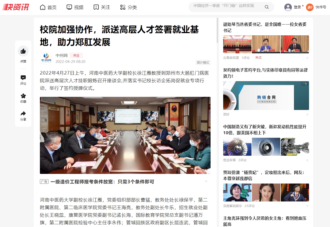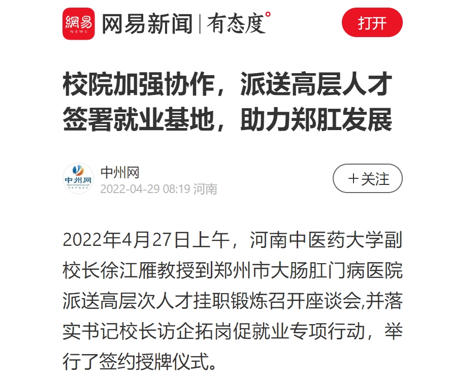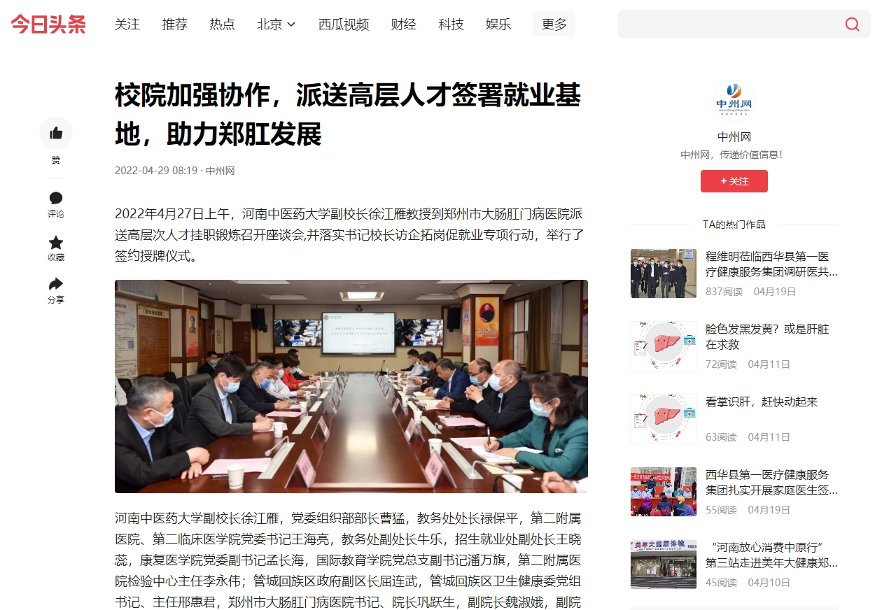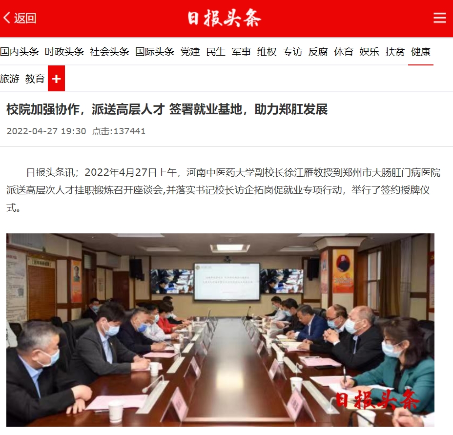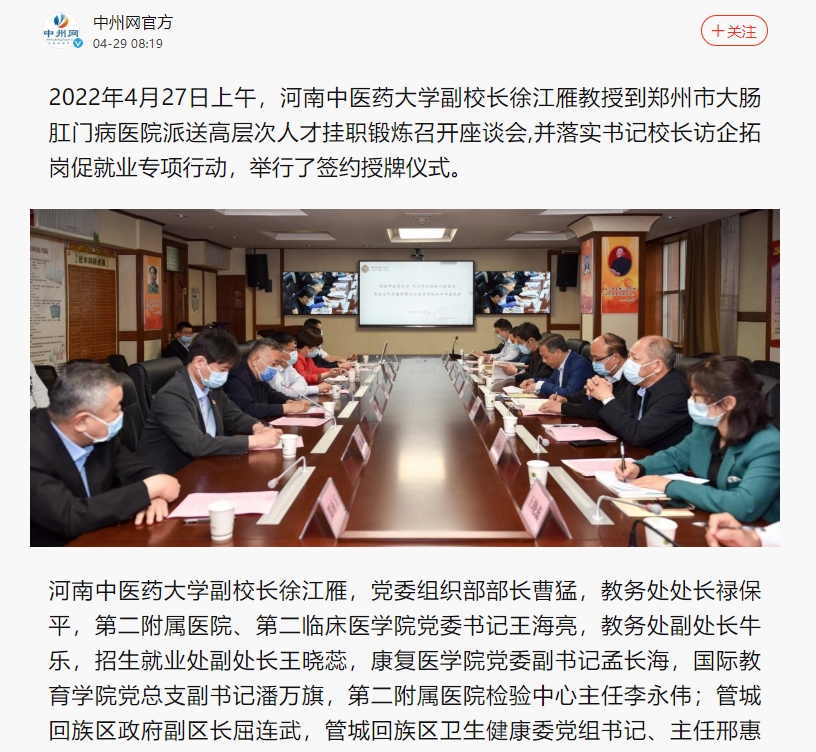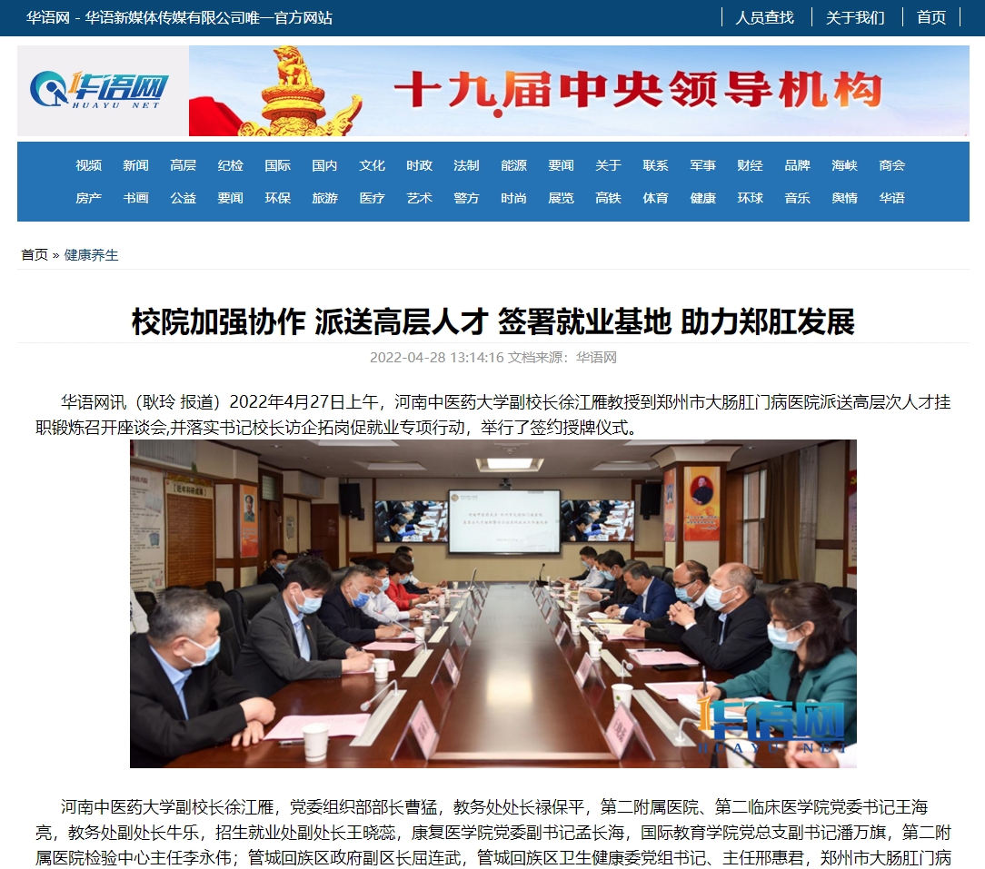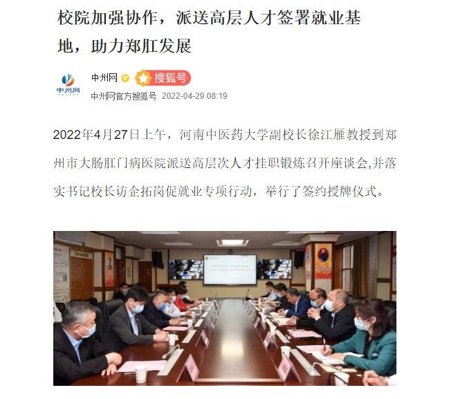 编者按:2022年4月27日-29日,华语网、中州网、快资讯、新浪新闻、网易新闻、今日头条、日报头条等多家媒体对leyu·乐鱼(中国)体育官方网站党委委员、副校长徐江雁到郑州市大肠肛门病医院派送高层次人才挂职锻炼召开座谈会,并落实书记校长访企拓岗促就业专项行动进行报道。