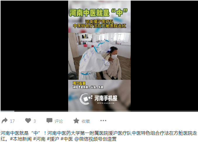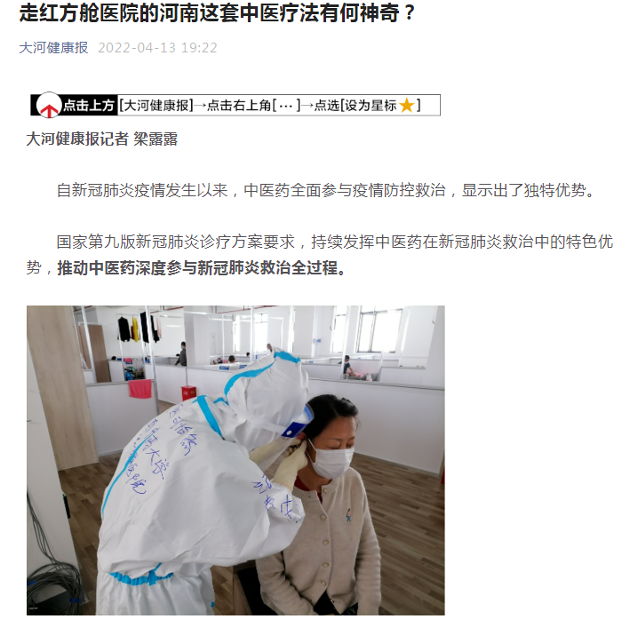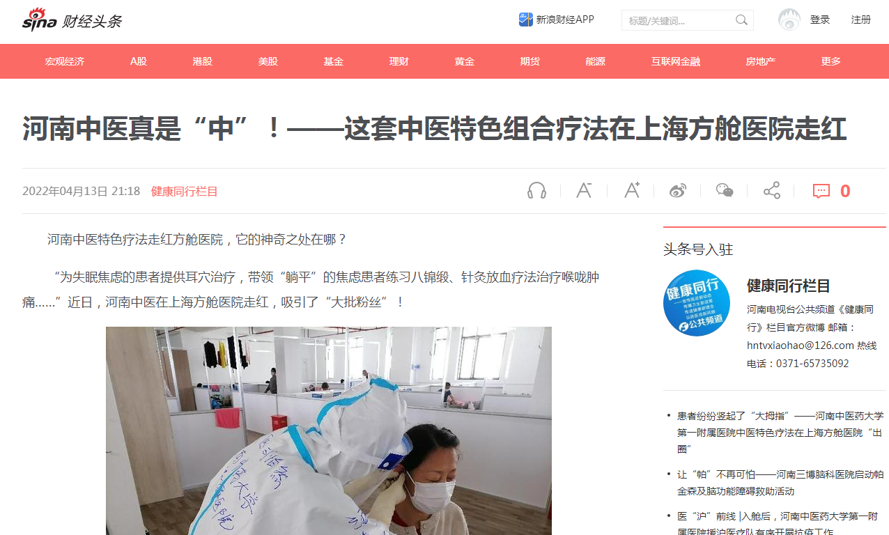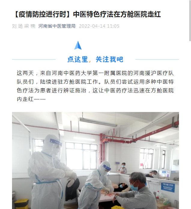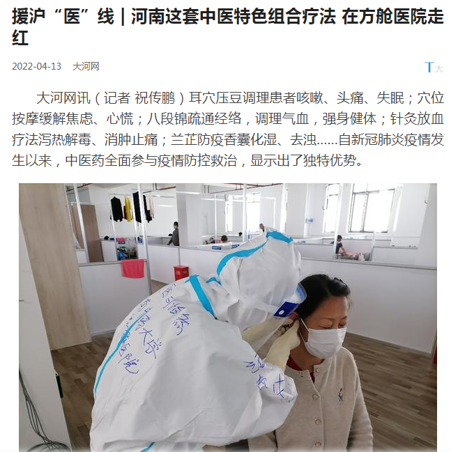 编者按:2022年4月13日,大河网、新浪网、医药卫生报官方微信、映象网、河南手机报、网易新闻、大河健康报、河南省中医管理局官方微信等多家媒体对leyu·乐鱼(中国)体育官方网站一附院援沪医疗队在方舱为患者采用中医药特色疗法进行诊疗进行报道。