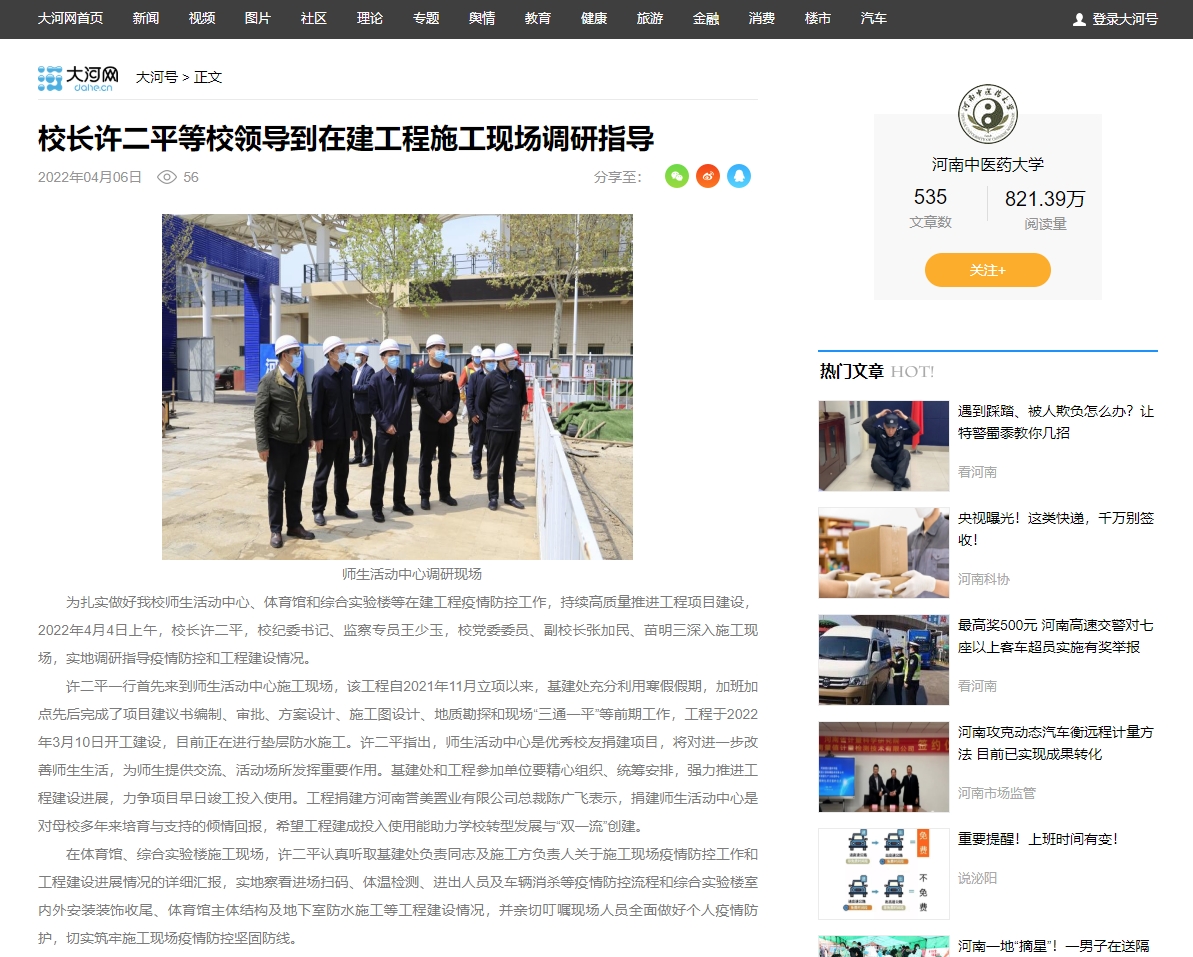 2022年4月6日,大河号对leyu·乐鱼(中国)体育官方网站校长许二平等校领导到在建工程施工现场调研指导进行报道。
