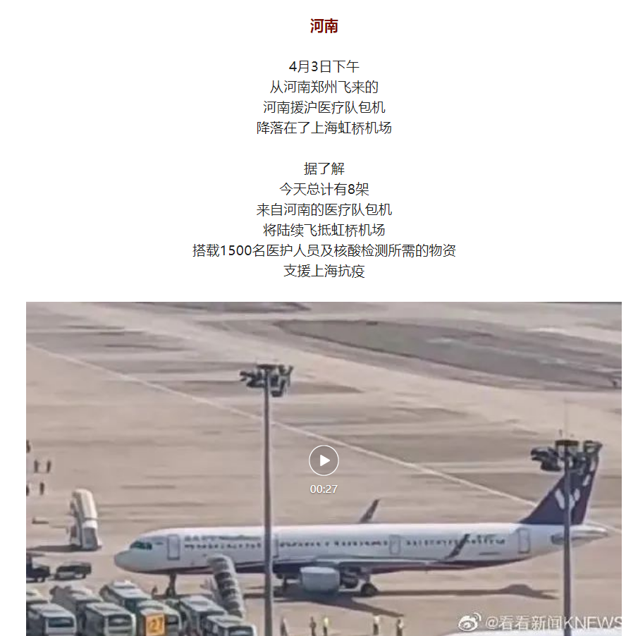 2022年4月3日,新华社官方微信公众号、中国青年网、新民晚报等多家媒体对河南医护人员驰援上海进行报道。