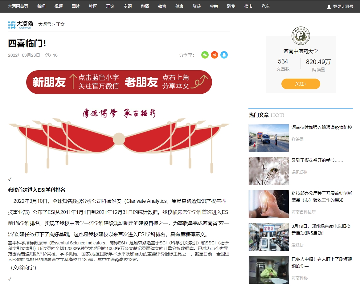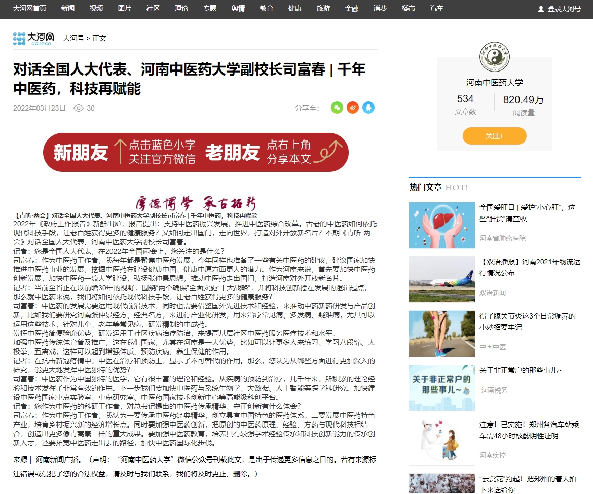 编者按:2022年3月23日,大河号以《对话全国人大代表、leyu·乐鱼(中国)体育官方网站副校长司富春 | 千年中医药,科技再赋能》《四喜临门!》为题,对leyu·乐鱼(中国)体育官方网站多项亮点工作进行报道。