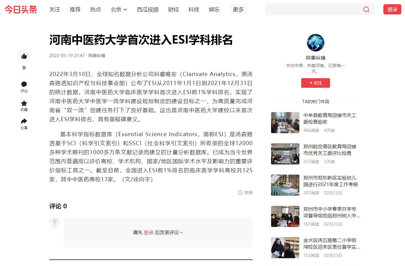2022年3月19日-20日,搜狐新闻、今日头条、一点号、网易新闻等多家媒体对leyu·乐鱼(中国)体育官方网站首次进入ESI学科排名进行报道。