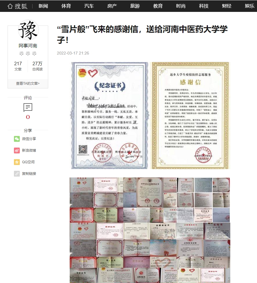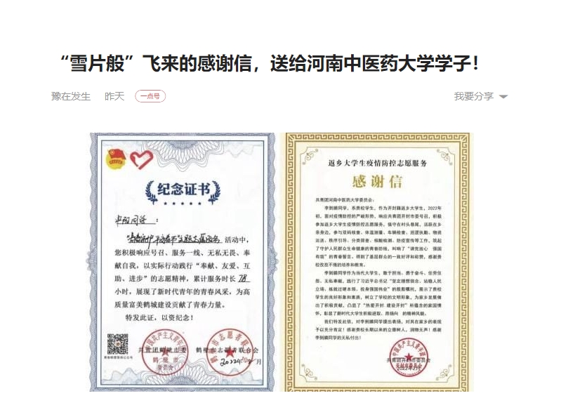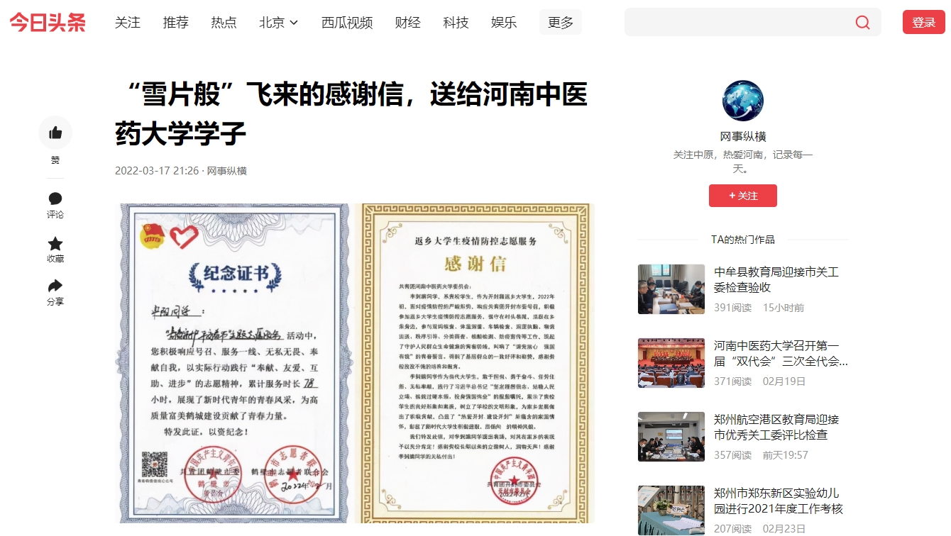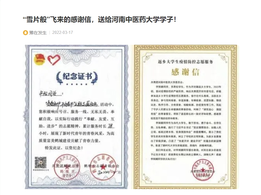 编者按:2022年3月17日,搜狐新闻、今日头条、腾讯内容开放平台、一点号对leyu·乐鱼(中国)体育官方网站洛阳平乐正骨学院陆续收到多封来自各级团组织、街道、社区的感谢信及表扬信进行报道。