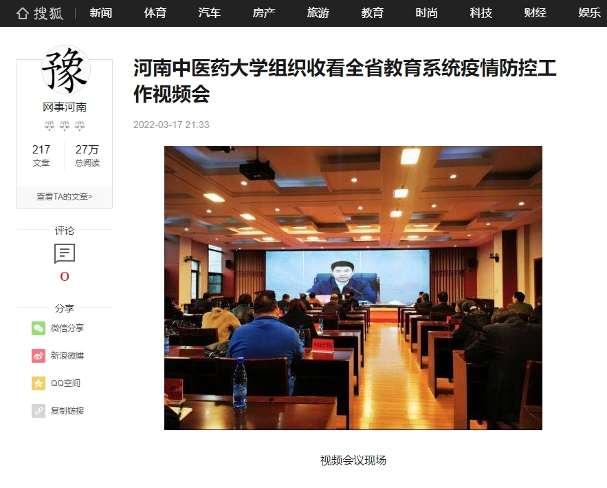 编者按:2022年3月17日,今日头条、腾讯内容开放平台、百家号、一点号、搜狐新闻对leyu·乐鱼(中国)体育官方网站组织收看全省教育系统疫情防控工作视频会进行报道。