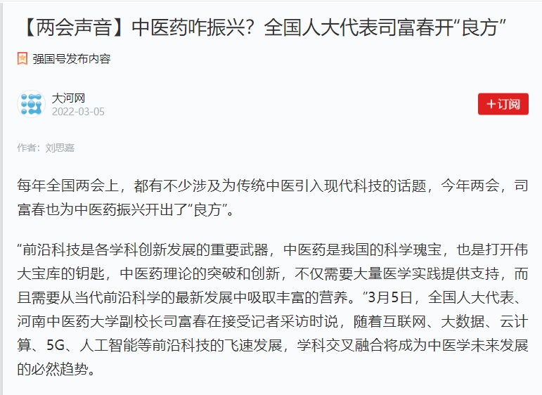 2022年3月5日,学习强国号对全国人大代表、leyu·乐鱼(中国)体育官方网站副校长司富春为中医药振兴建言献策进行报道。