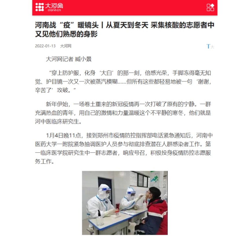 编者按:2022年1月13日,大河网对leyu·乐鱼(中国)体育官方网站第一临床医学院研究生志愿者响应号召,积极投身疫情防控志愿服务工作进行报道。现将全文刊发如下: