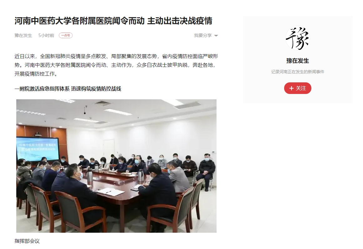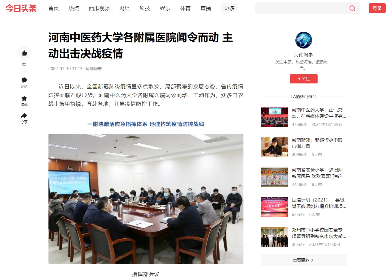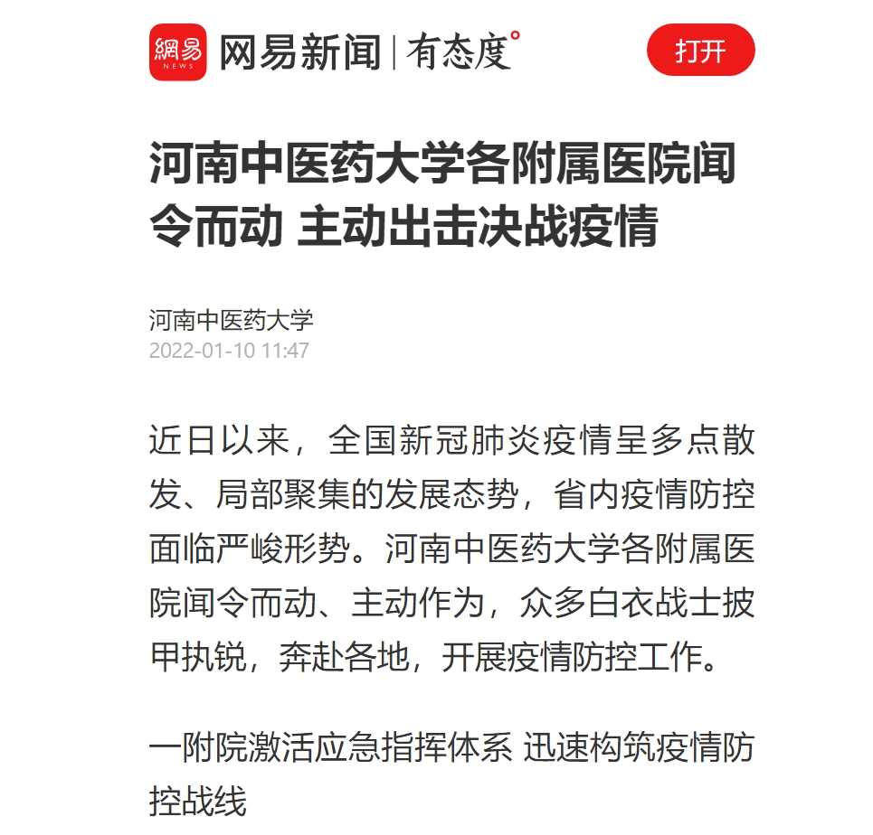 编者按:2022年1月10日,今日头条、一点资讯、搜狐、网易新闻、腾讯内容开放平台等多家媒体对leyu·乐鱼(中国)体育官方网站各附属医院闻令而动,主动出击决战疫情的事迹进行报道。