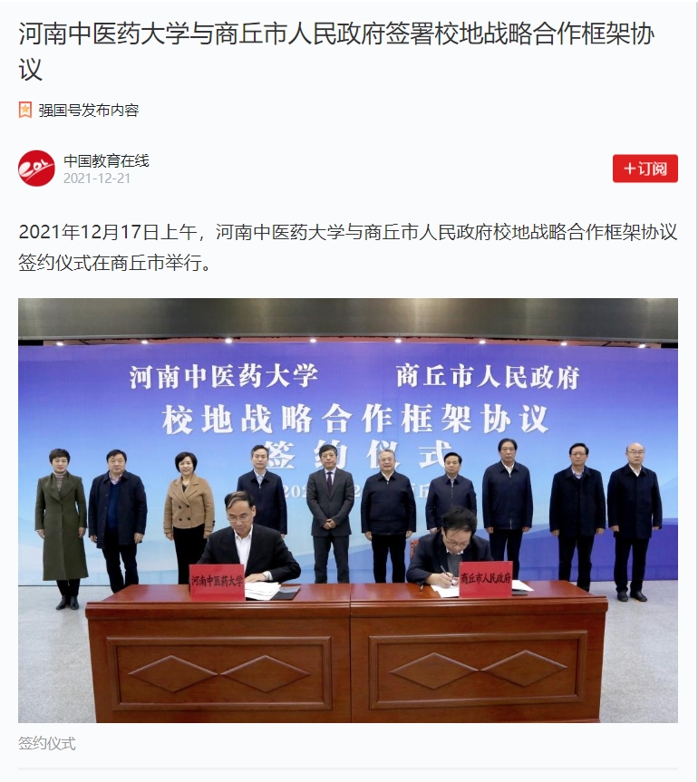 2021年12月21日,学习强国对leyu·乐鱼(中国)体育官方网站与商丘市人民政府签署校地战略合作框架协议进行报道。