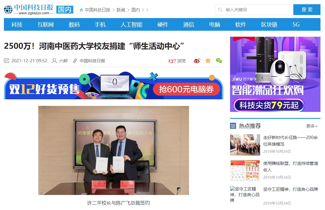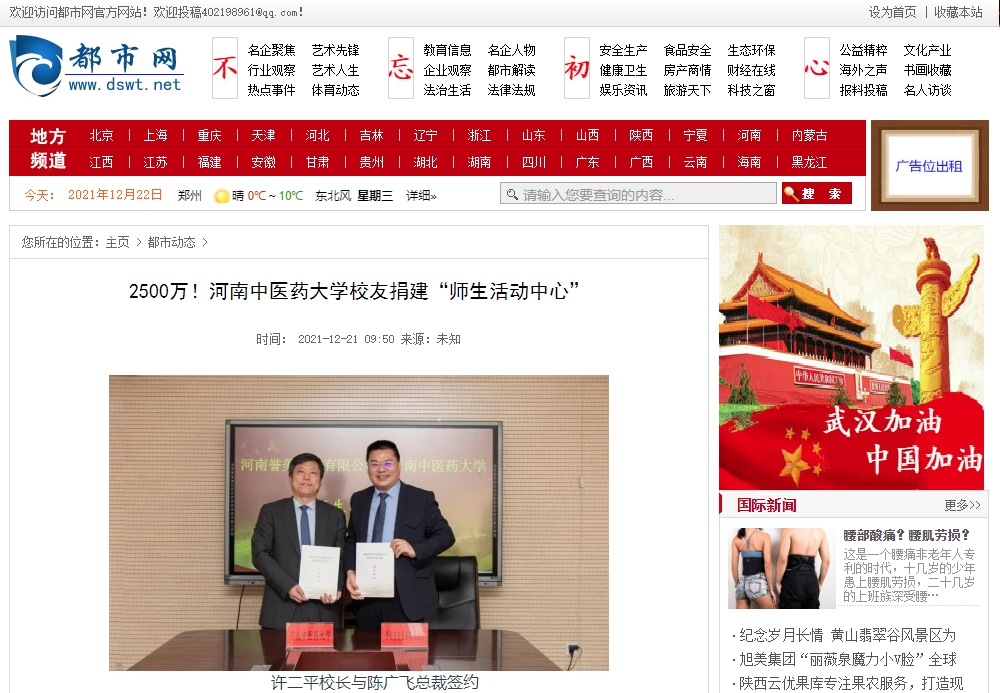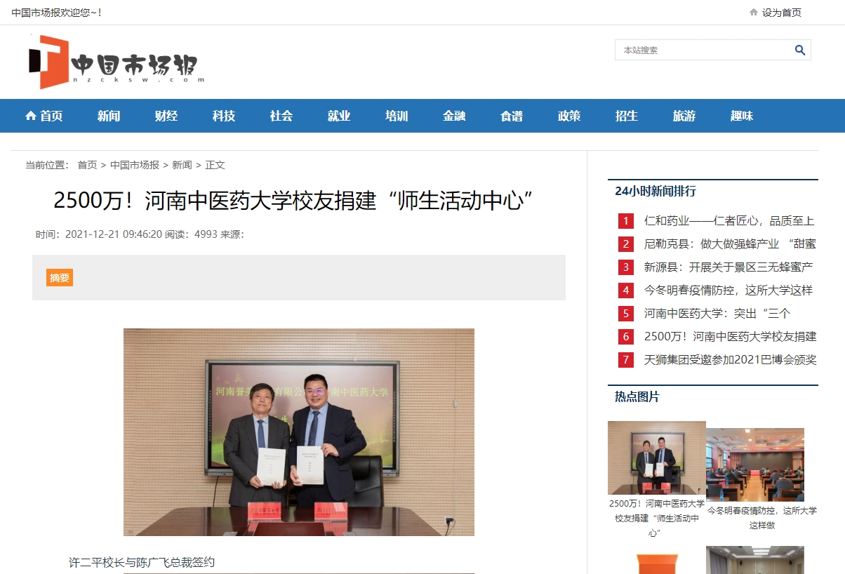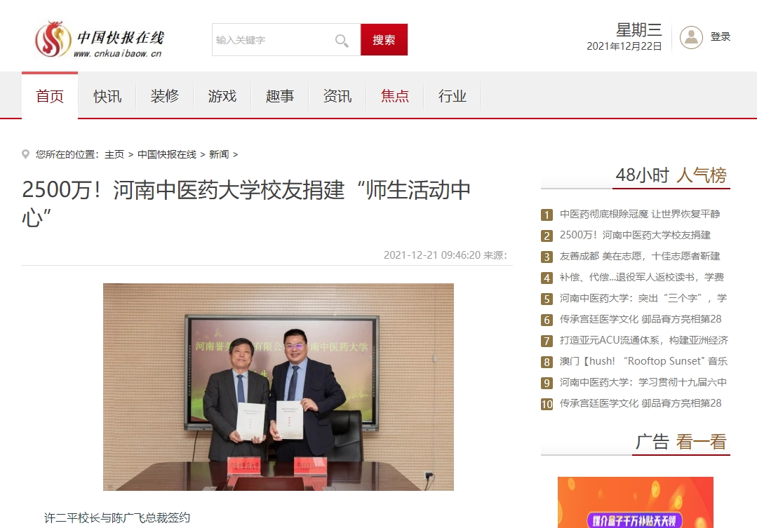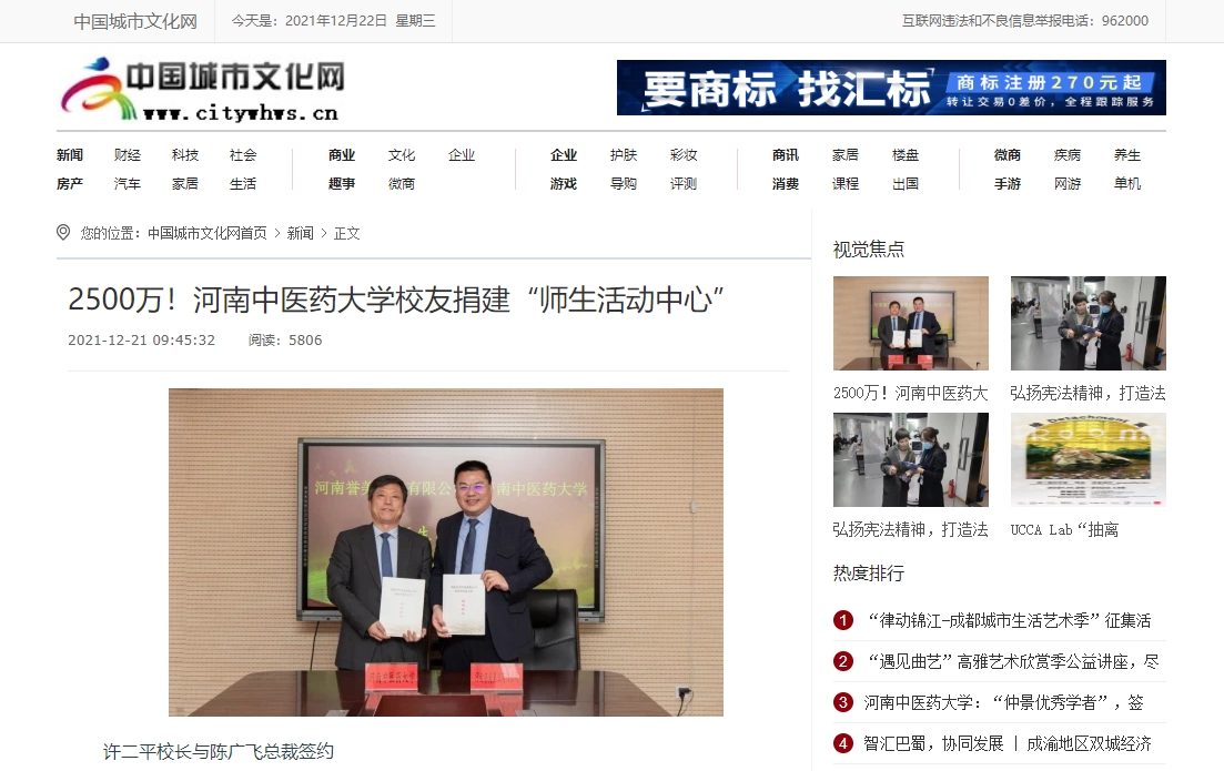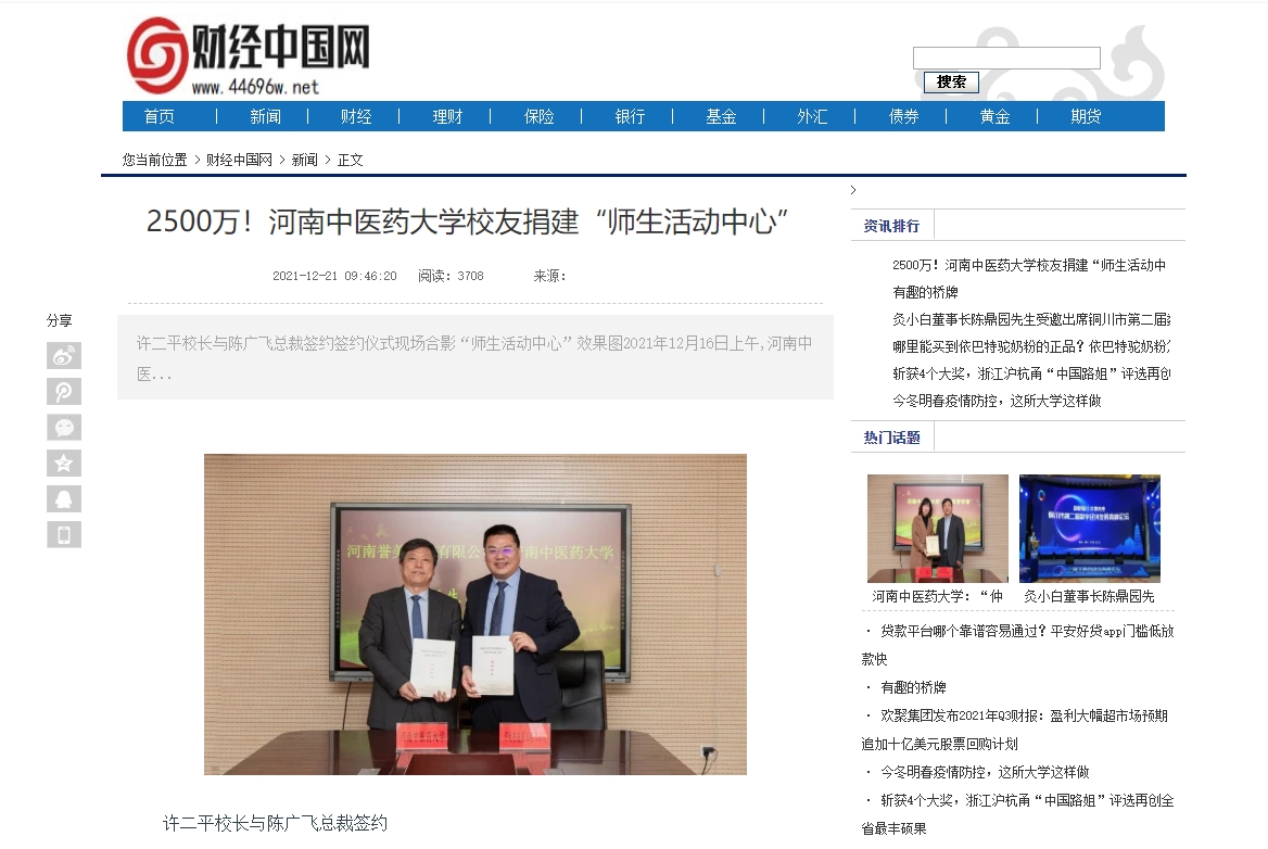 编者按:2021年12月21日,中国健康新闻网、中国城市文化网、中国都市新闻网、财经中国、中国科技日报、中国快报在线、中国市场报、中国之窗、中国科技在线网等多家媒体对leyu·乐鱼(中国)体育官方网站校友捐建“师生活动中心”进行报道。
