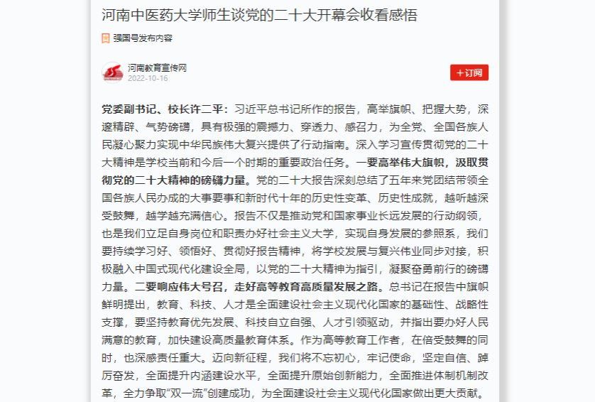 校党委副书记、校长许二平:习近平总书记所作的报告,高举旗帜、把握大势,深邃精辟、气势磅礴,具有极强的震撼力、穿透力、感召力,为全党、全国各族人民凝心聚力实现中华民族伟大复兴提供了行动指南。深入学习宣传贯彻党的二十大精神是学校当前和今后一个时期的重要政治任务。一要高举伟大旗帜,汲取贯彻党的二十大精神的磅礴力量。党的二十大报告深刻总结了五年来党团结带领全国各族人民办成的大事要事和新时代十年的历史性变革、历史性成就,越听越深受鼓舞,越学越充满信心。报告不仅是推动党和国家事业长远发展的行动纲领,也是我们立足自身岗位和职责办好社会主义大学,实现自身发展的参照系,我们要持续学习好、领悟好、贯彻好报告精神,将学校发展与复兴伟业同步对接,积极融入中国式现代化建设全局,以党的二十大精神为指引,凝聚奋勇前行的磅礴力量。二要响应伟大号召,走好高等教育高质量发展之路。总书记在报告中旗帜鲜明提出,教育、科技、人才是全面建设社会主义现代化国家的基础性、战略性支撑,要坚持教育优先发展、科技自立自强、人才引领驱动,并指出要办好人民满意的教育,加快建设高质量教育体系。作为高等教育工作者,在倍受鼓舞的同时,也深感责任重大。迈向新征程,我们将不忘初心,牢记使命,坚定自信、踔厉奋发,全面提升内涵建设水平,全面提升原始创新能力,全面推进体制机制改革,全力争取“双一流”创建成功,为全面建设社会主义现代化国家做出更大贡献。三要牢记使命担当,把握中医药事业传承创新发展的重要契机。总书记在党的二十大报告中提出,要推进健康中国建设,把保障人民健康放在优先发展的战略位置,并专门提到要促进中医药传承创新发展。作为中医药事业的传承者、发扬者,我们要进一步提升办好中医药高等教育、推进中医药事业传承创新发展的信心和干劲。加快中医药人才培养模式改革,持续释放中医药科研活力,提供中医药科技支撑,提升中医药诊疗服务水平,全力创建“国家中医医学中心”,加强产学研融合,加大成果转化力度,助力中医药产业振兴,擦亮“仲景品牌”,以传承创新发展中医药文化为主线,探源中华文明,坚定文化自信,促进文化交流传播,打造中医药行业一流创新人才培养高地,构筑中医药科技、产业、服务创新集聚地和策源地。不负重托,守正创新,积极融入新的伟大奋斗,在全面推进中华民族伟大复兴的新征程上书写更加出彩的中医药篇章!