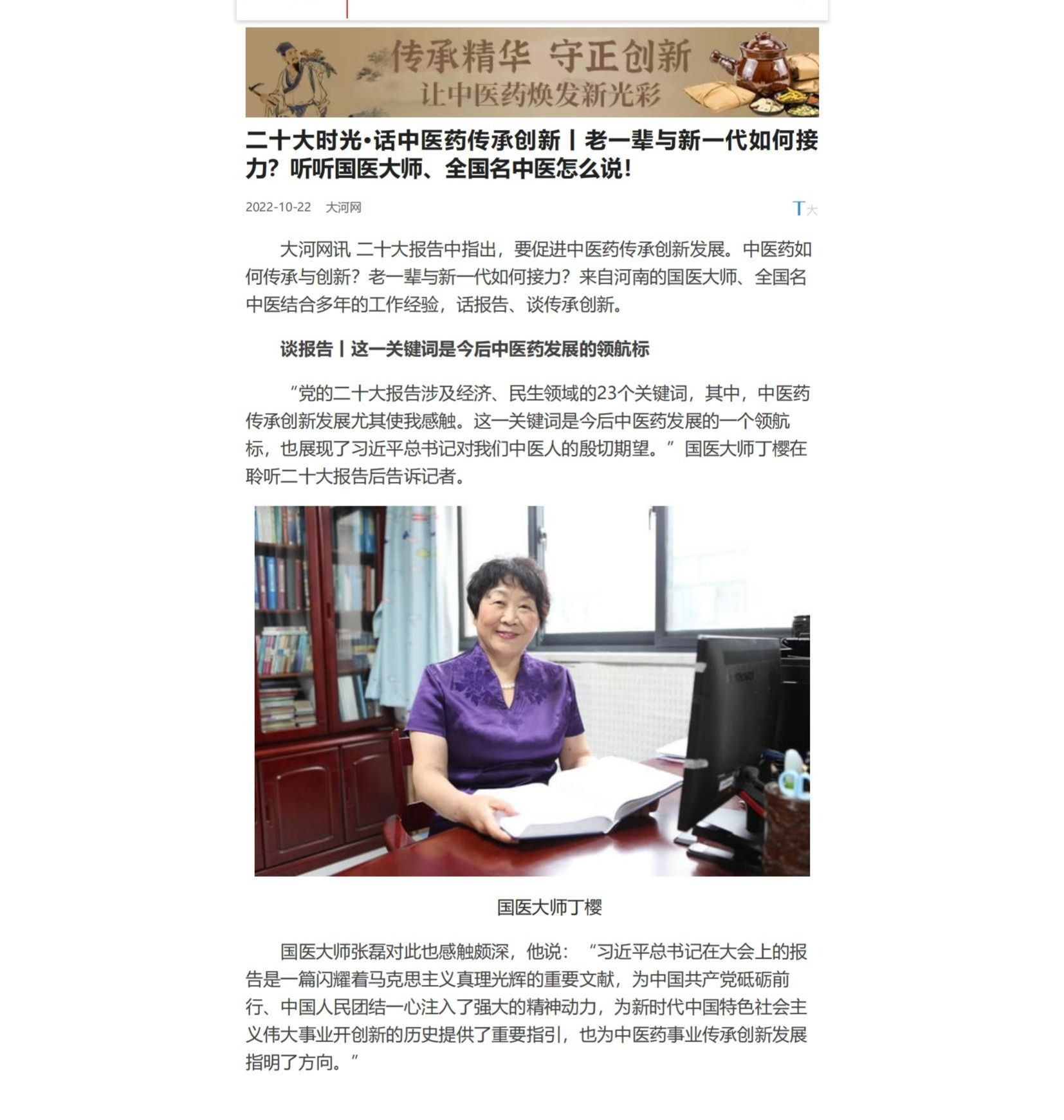 编者按:2022年10月22日,大河网以《二十大时光·话中医药传承创新 老一辈与新一代如何按力?听听国医大师、全国名中医怎么说!》为题,分别刊载了leyu·乐鱼(中国)体育官方网站国医大师丁樱、张磊,全国名中医郑玉玲的发言。