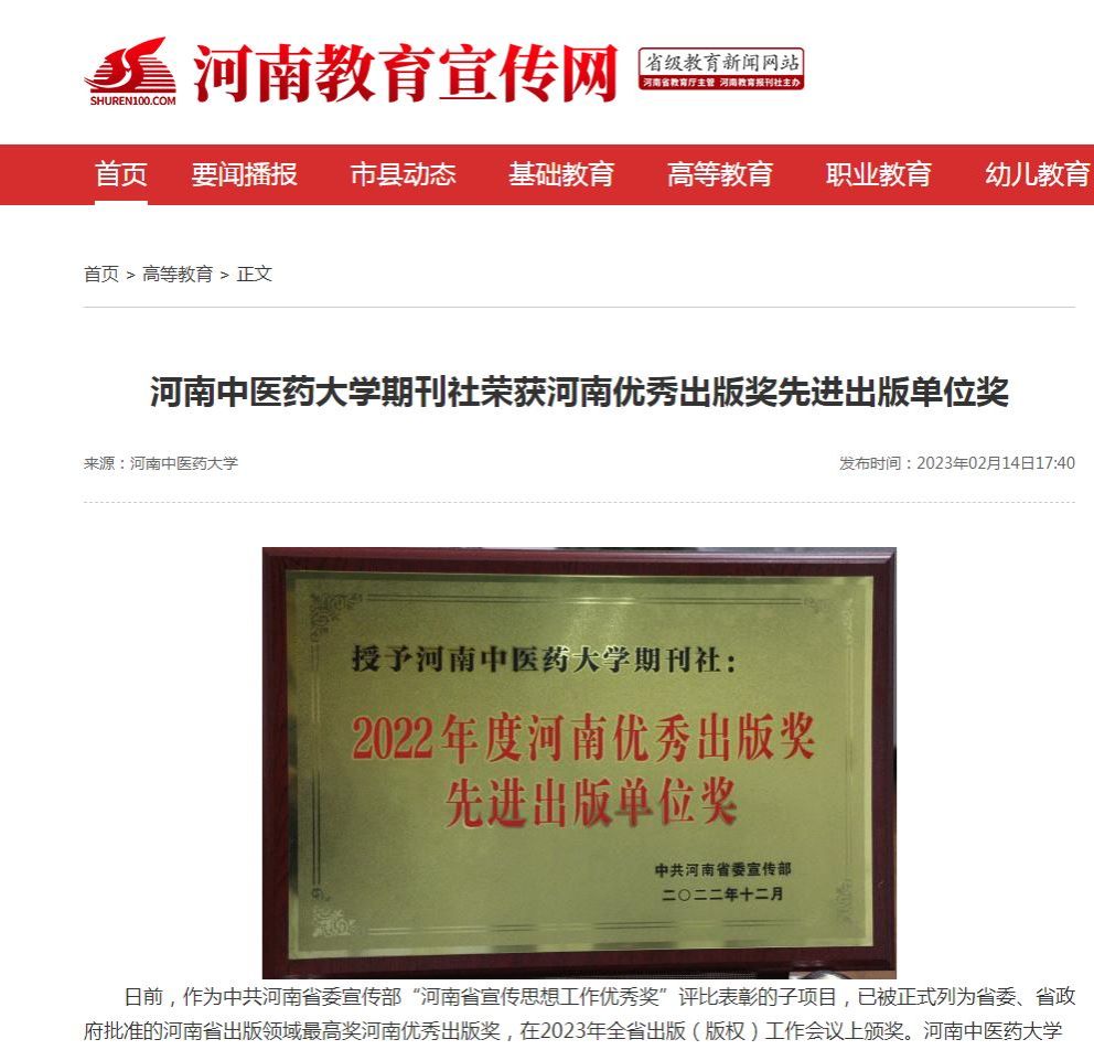 河南教育宣传网丨leyu·乐鱼(中国)体育官方网站期刊社荣获河南优秀出版奖先进出版单位奖